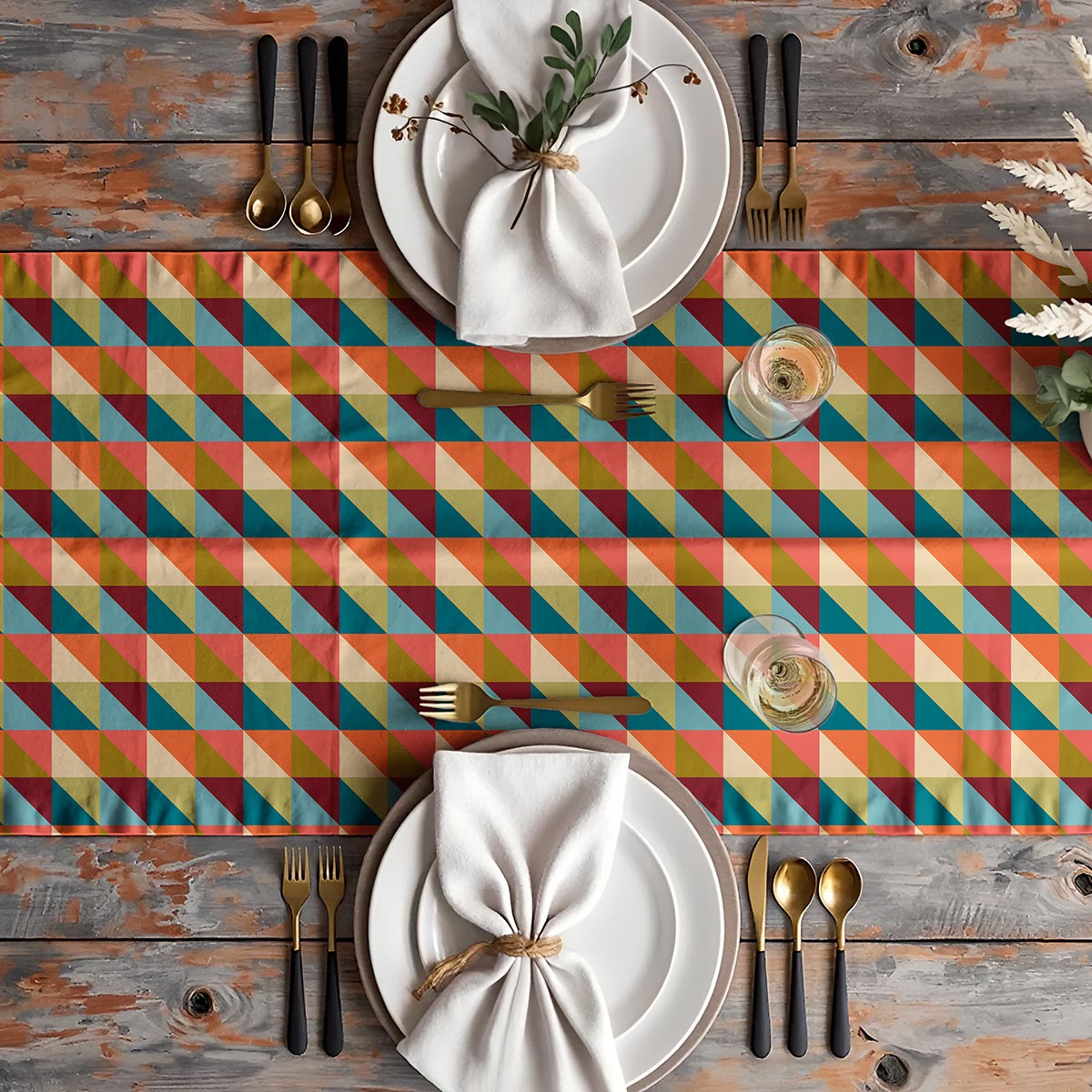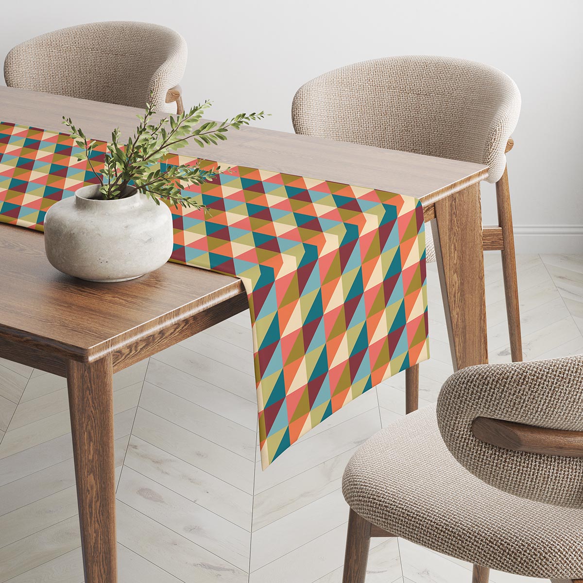 Ten bieżnik przyciąga wzrok mozaiką drobnych trójkątów w ciepłych, nasyconych barwach — koral, oliwka i turkus tworzą tu harmonijną kompozycję. Wzór jest wyrazisty, ale jednocześnie daje możliwość łatwego zestawienia z naturalnymi drewnianymi i neutralnymi elementami stołu.