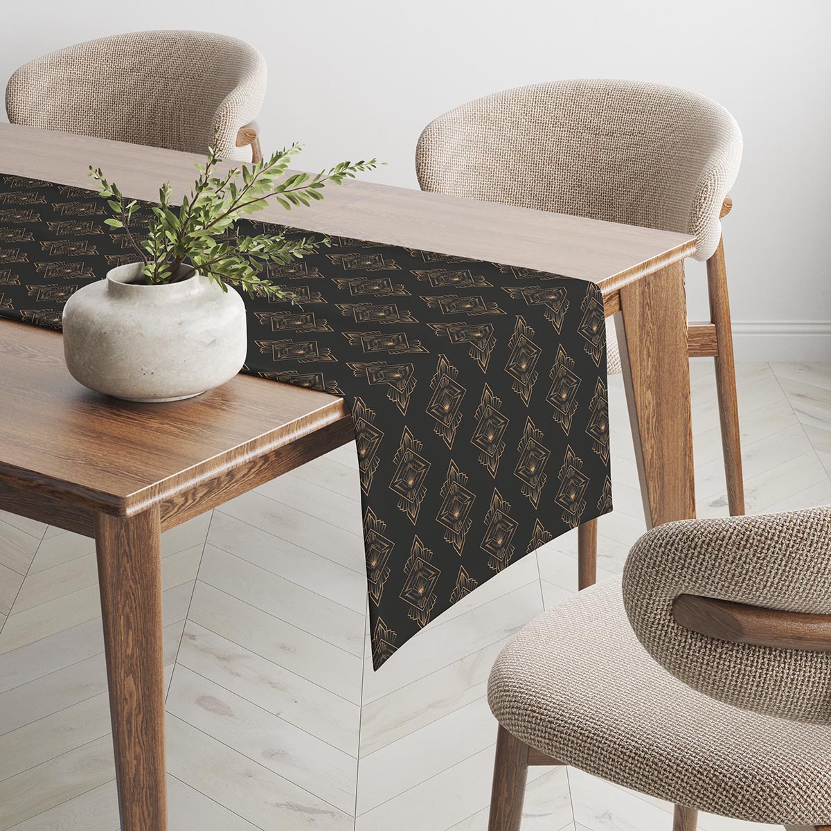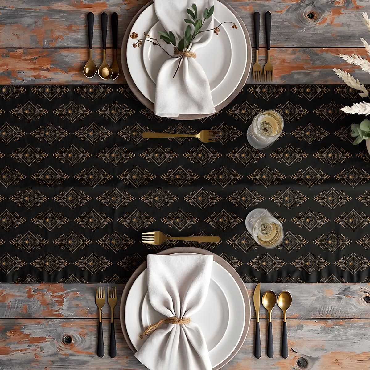 Bieżnik łączy głęboką czerń z delikatnymi złotymi ornamentami w stylu art deco. Doskonale podkreśla eleganckie aranżacje stołu zarówno na codzienne posiłki, jak i wyjątkowe okazje.