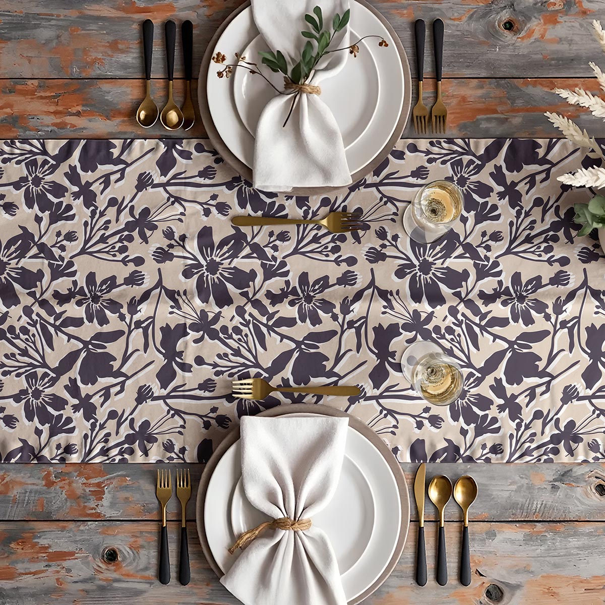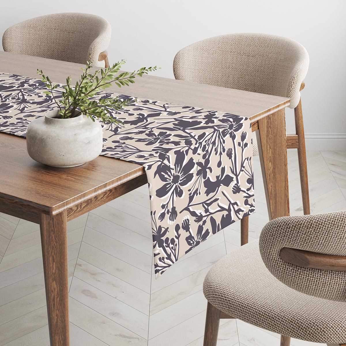 Ten bieżnik łączy klasyczną paletę beżu z wyrazistym, ale subtelnym motywem kwiatowym, który tworzy efekt lekkiego ruchu na stole. Neutralne tło i kontrastujące kontury kwiatów sprawiają, że wzór jest widoczny z bliska i elegancki z dalszej perspektywy.