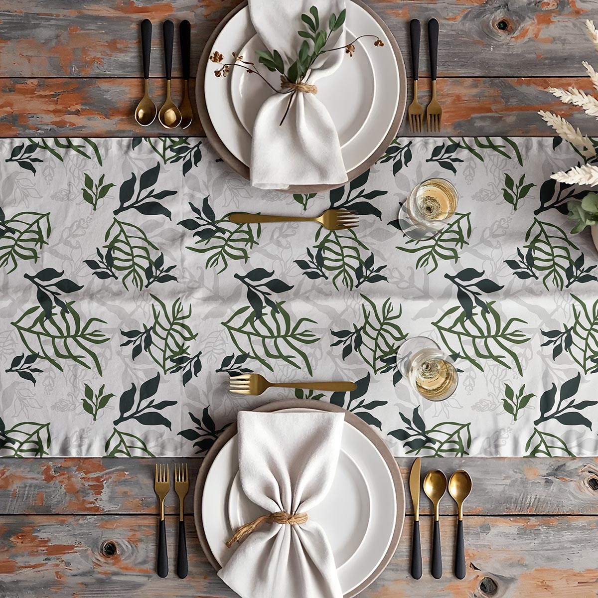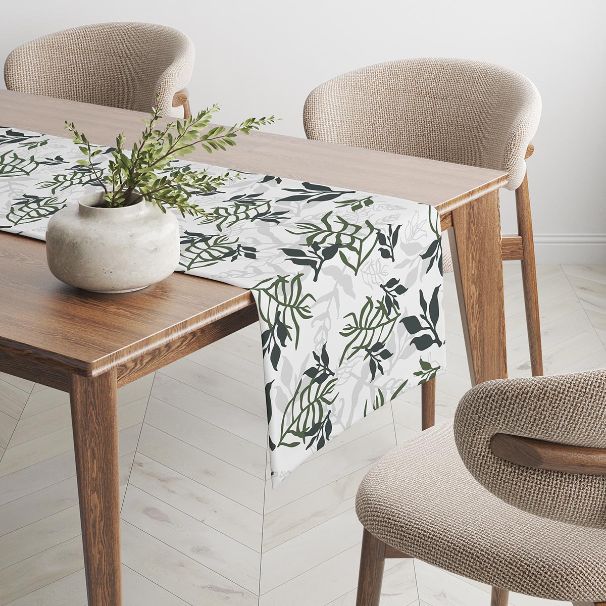 Ten bieżnik zdobią delikatne sylwetki liści w różnych odcieniach zieleni na jasnym tle, tworząc uporządkowany, a jednocześnie organiczny wzór. Grafika jest stonowana i sprawdzi się przez cały rok, wprowadzając do jadalni lub kuchni naturalny akcent.