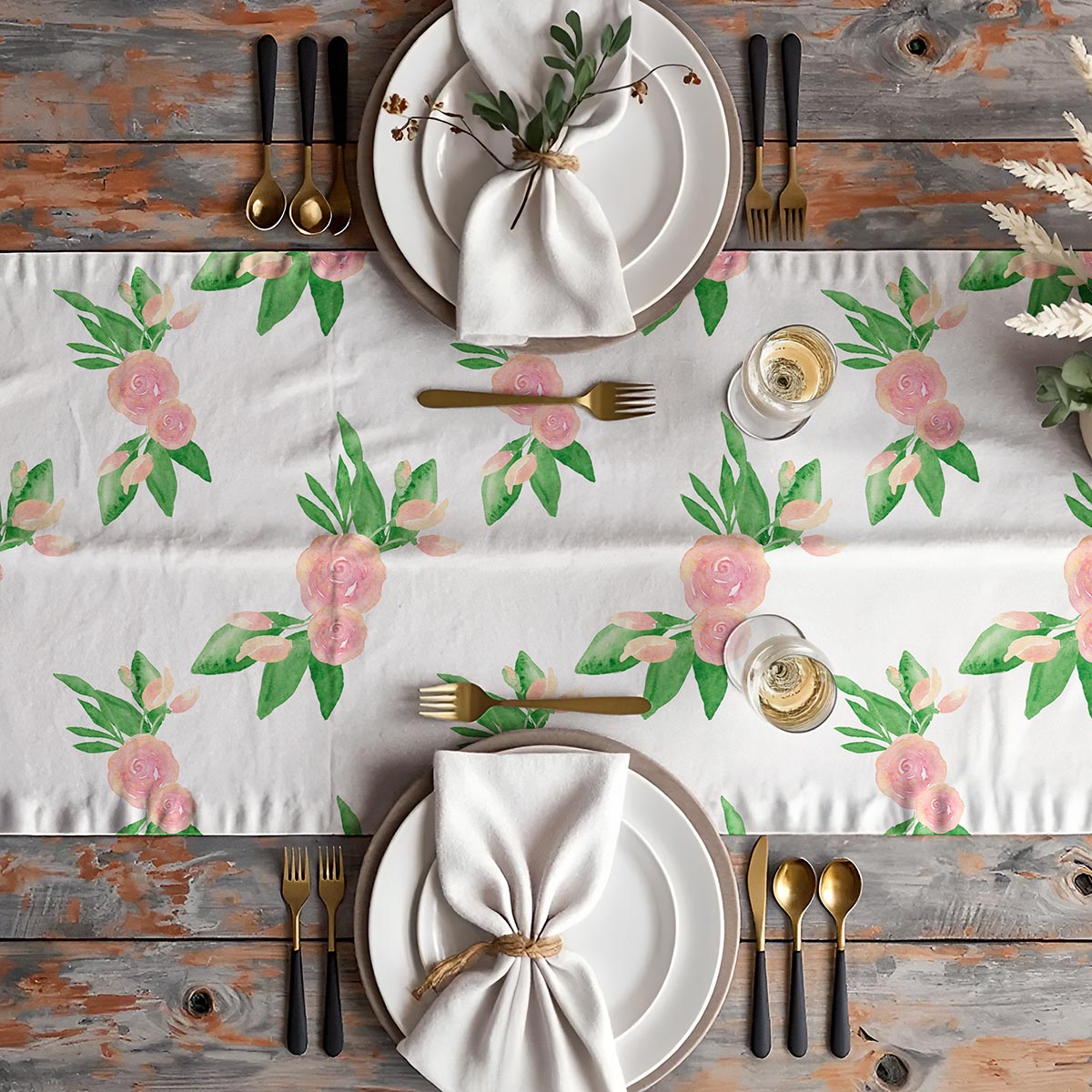 Subtelny bieżnik z motywem akwarelowych róż i zielonych listków wnosi do wnętrza lekkość i świeżość. Idealny zarówno na co dzień, jak i podczas wyjątkowych spotkań, podkreśli naturalny charakter stołu.