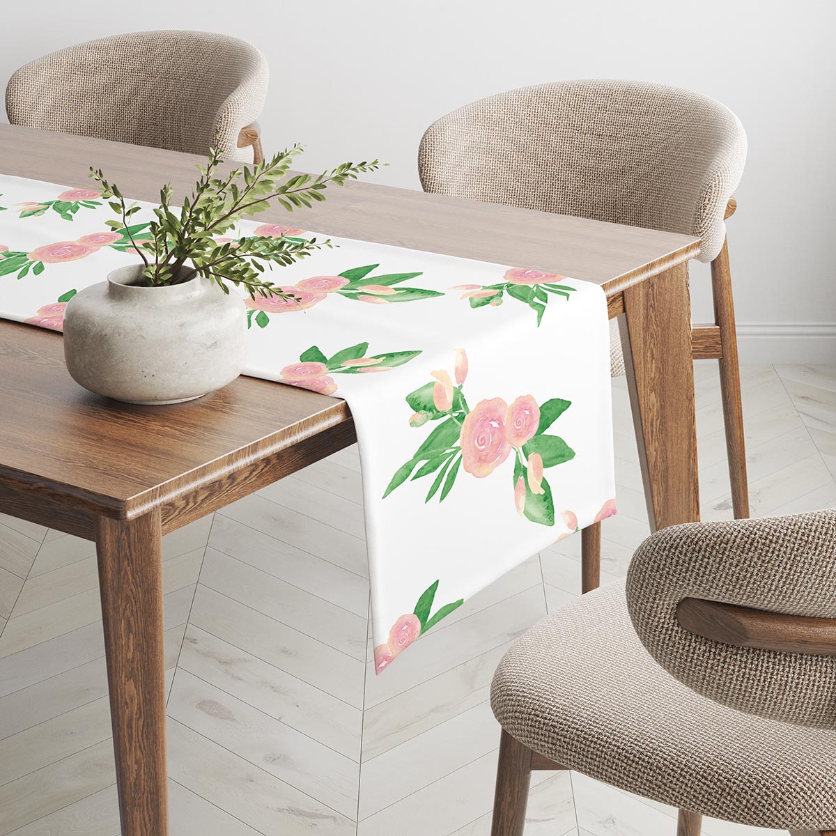 Ten bieżnik ozdobiony jest motywem delikatnych, różowych róż uzupełnionych żywą zielenią liści. Wzór przypomina ręcznie malowaną akwarelę, która dodaje aranżacji subtelnej, romantycznej elegancji. Tkanina ma przyjemną strukturę i estetyczne wykończenie, co sprawia, że bieżnik prezentuje się schludnie zarówno w codziennym użyciu, jak i na specjalne okazje.
