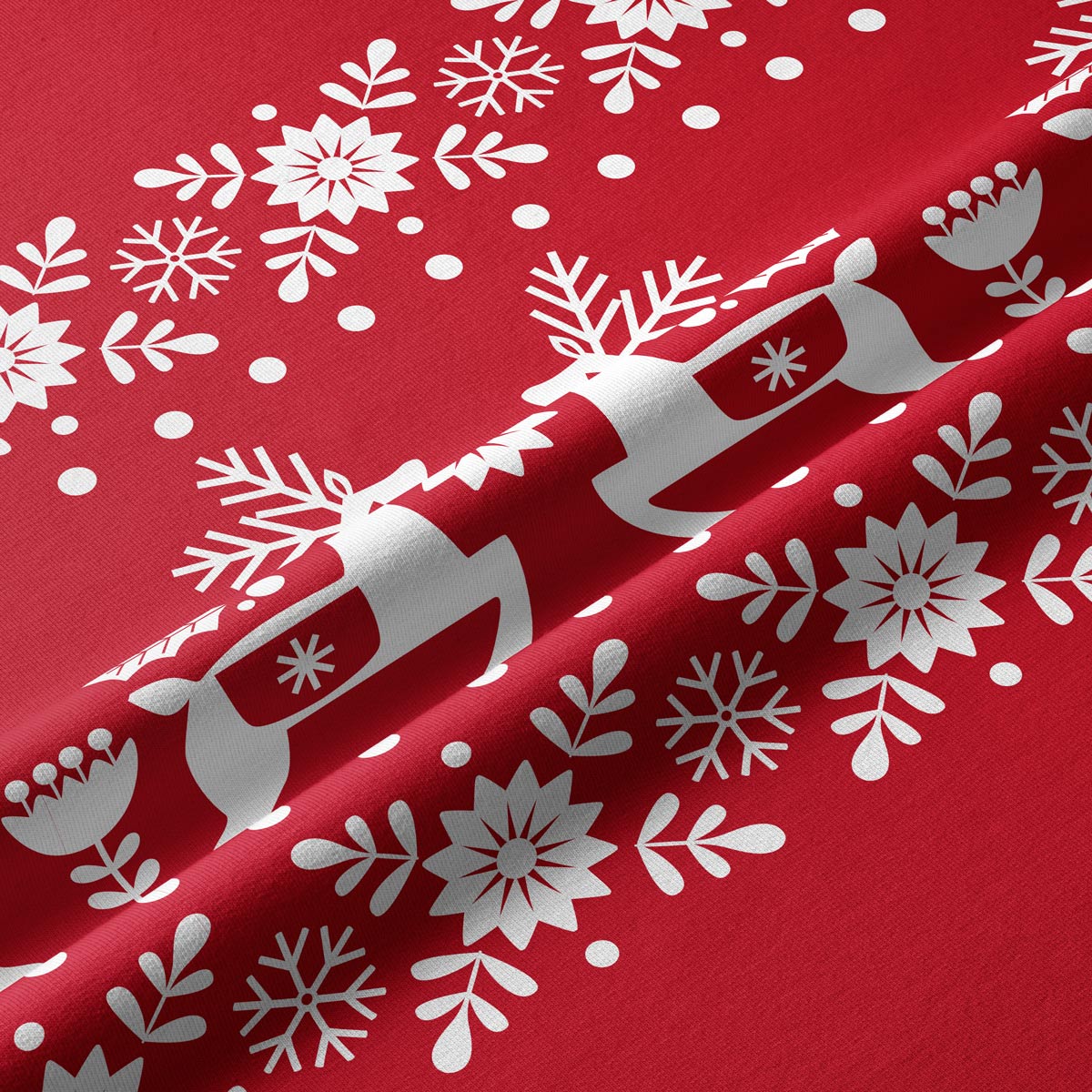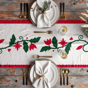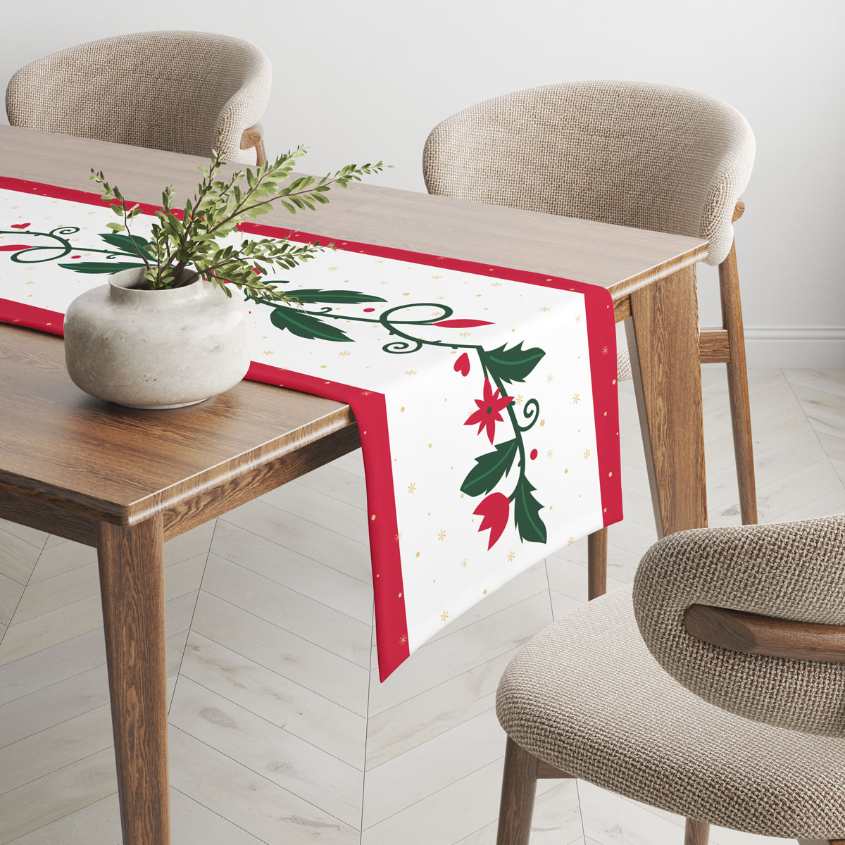 Elegancki świąteczny bieżnik w białej tonacji, ozdobiony czerwono-zielonym motywem roślinnym i subtelnymi złotymi akcentami. Wprowadza do wnętrza świąteczne ciepło, naturalność i lekkość. Idealny na wigilijną kolację, rodzinne spotkania oraz zimowe dekoracje stołu w nowoczesnych i klasycznych aranżacjach.