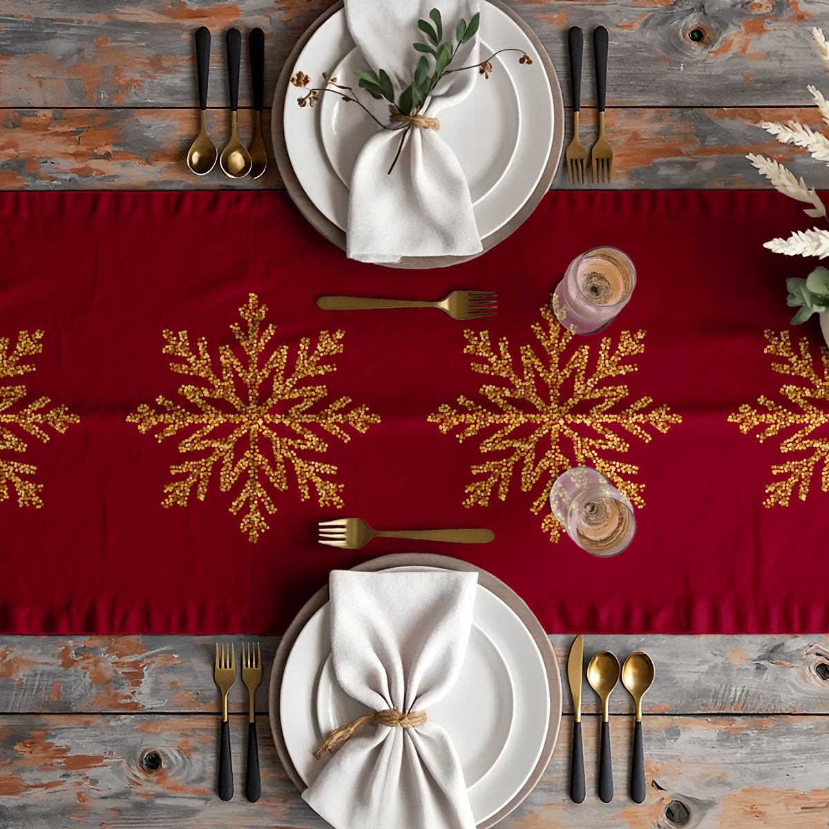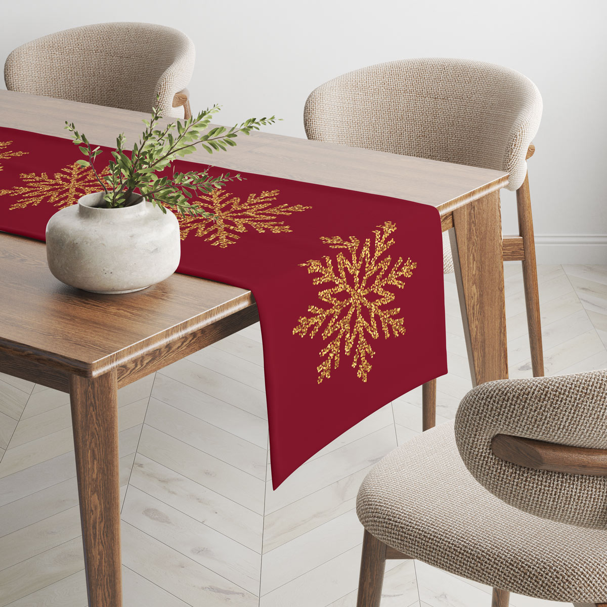 Elegancki bordowy bieżnik świąteczny zdobiony złotymi śnieżynkami, które nadają wnętrzu blasku i wyjątkowo odświętnego charakteru. Idealny na zimowe kolacje, świąteczne spotkania i dekorację stołu w okresie Świątecznym