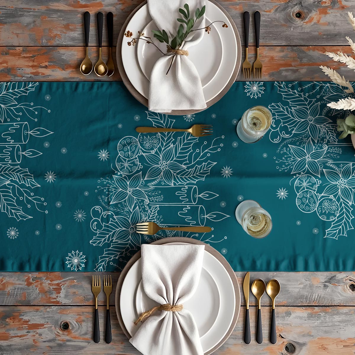 Elegancki świąteczny bieżnik w odcieniu głębokiej morskiej zieleni z delikatnym, białym wzorem świec, liści i zimowych dekoracji. Wprowadza do wnętrza nastrojowe światło i subtelny, zimowy klimat. Idealny na świąteczne kolacje, rodzinne spotkania i dekorację stołu w grudniowym okresie.