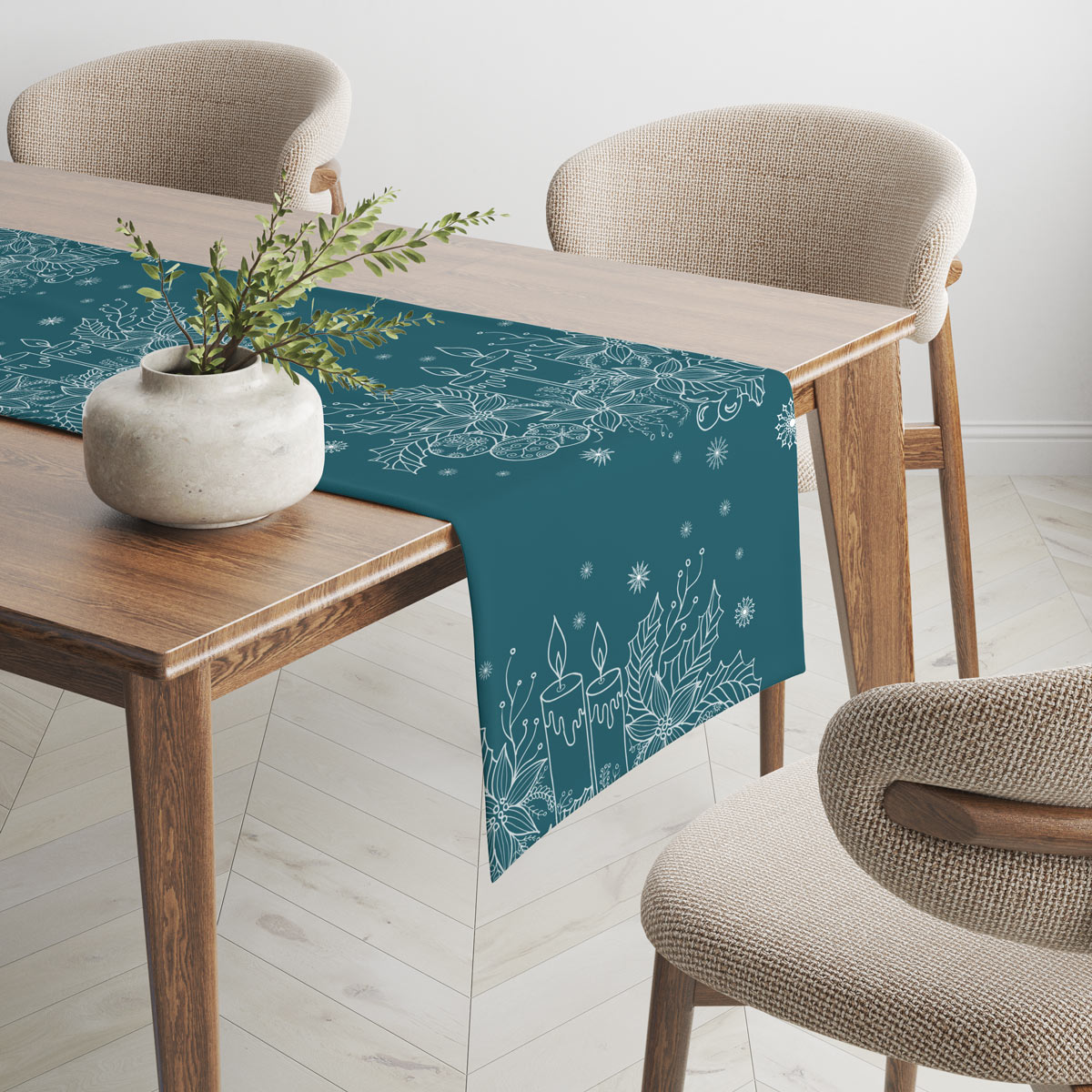 Stylowy i wyrazisty bieżnik świąteczny w głębokim, morskim kolorze, ozdobiony eleganckim białym wzorem świec, liści ostrokrzewu, gwiazdek i zimowych gałązek. To wzór, który łączy świąteczną atmosferę z lekką, minimalistyczną linią graficzną.