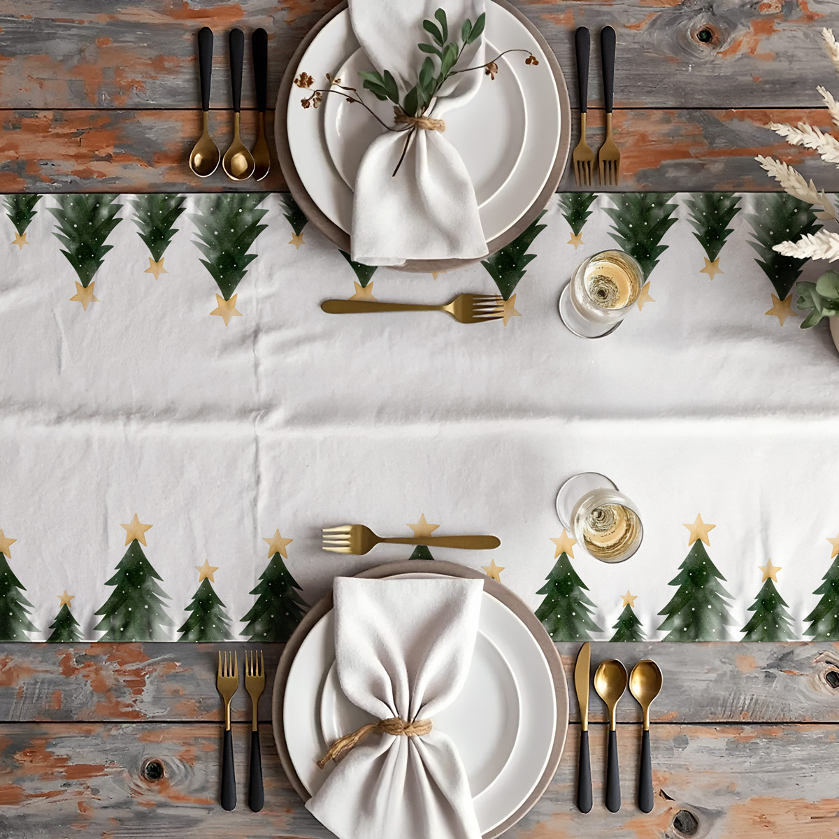 Zielone choinki z delikatnym efektem akwareli pięknie kontrastują z bielą tkaniny, a złote gwiazdki dodają całości blasku i podkreślają świąteczny charakter. Bieżnik świetnie komponuje się z naturalnymi dodatkami, zastawą w odcieniach złota oraz minimalistycznym wystrojem.