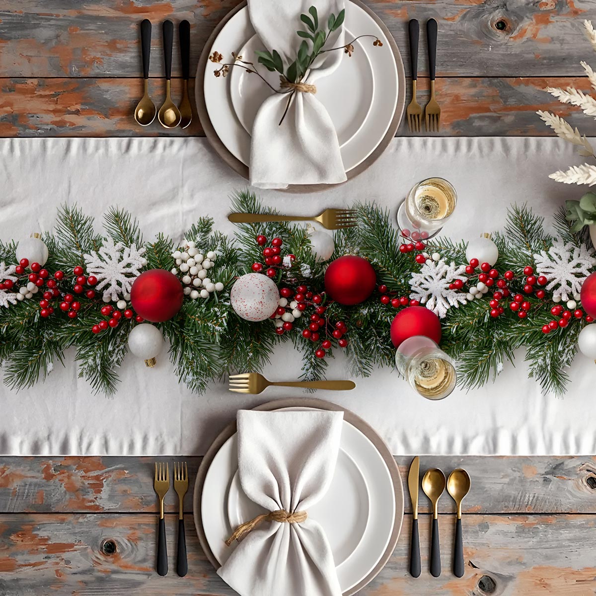 Elegancki bieżnik świąteczny w białym kolorze z realistycznym motywem zielonych gałązek świerku, czerwonych bombek, śnieżynek i zimowych dekoracji. Wprowadza do wnętrza magię świąt, ciepło i wyjątkową atmosferę. Idealny na rodzinne kolacje, wigilijny stół i zimowe przyjęcia.