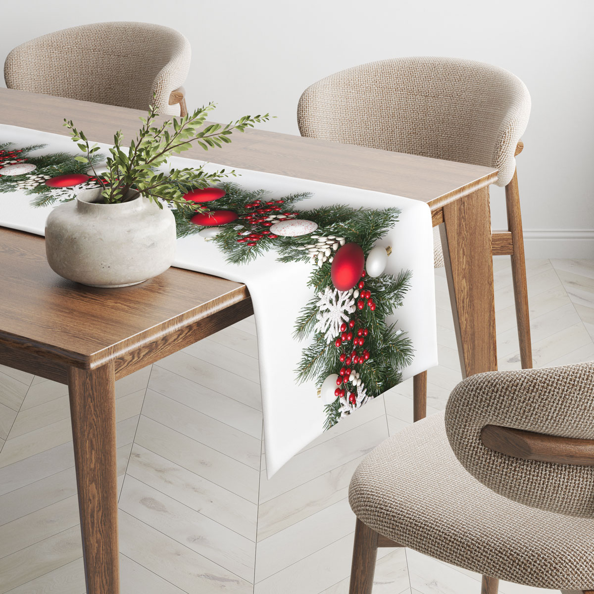 Stylowy i efektowny bieżnik świąteczny w białym kolorze, ozdobiony realistycznym motywem zimowej kompozycji z zielonych gałązek świerku, czerwonych bombek, białych ozdób i śnieżynek. Ten klasyczny, elegancki wzór pięknie podkreśli świąteczny nastrój Twojego wnętrza.