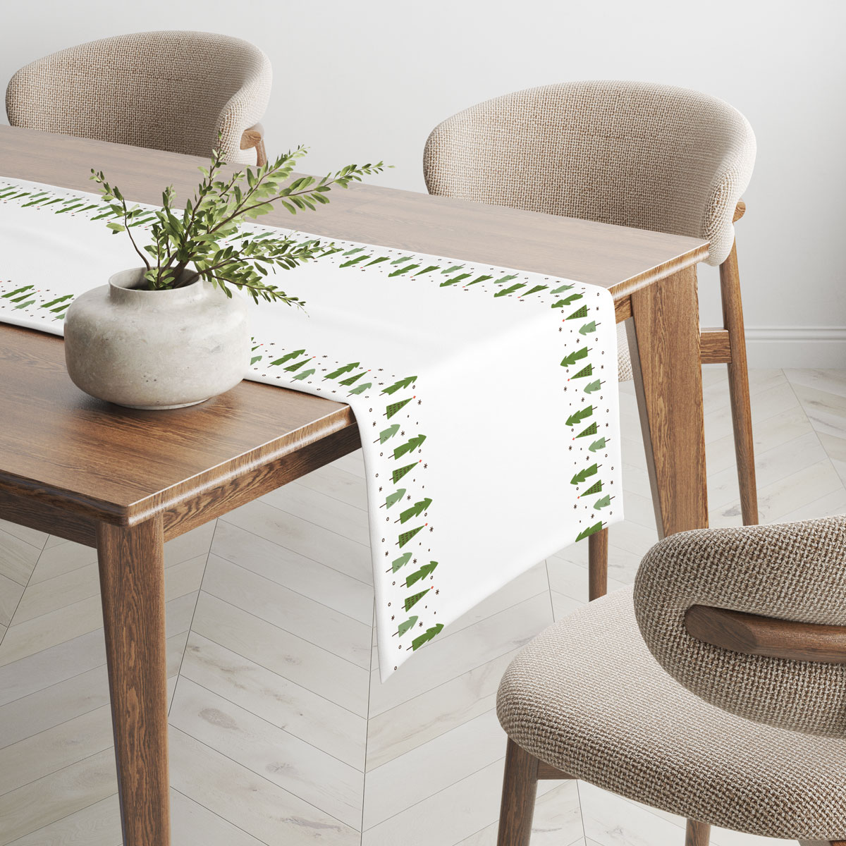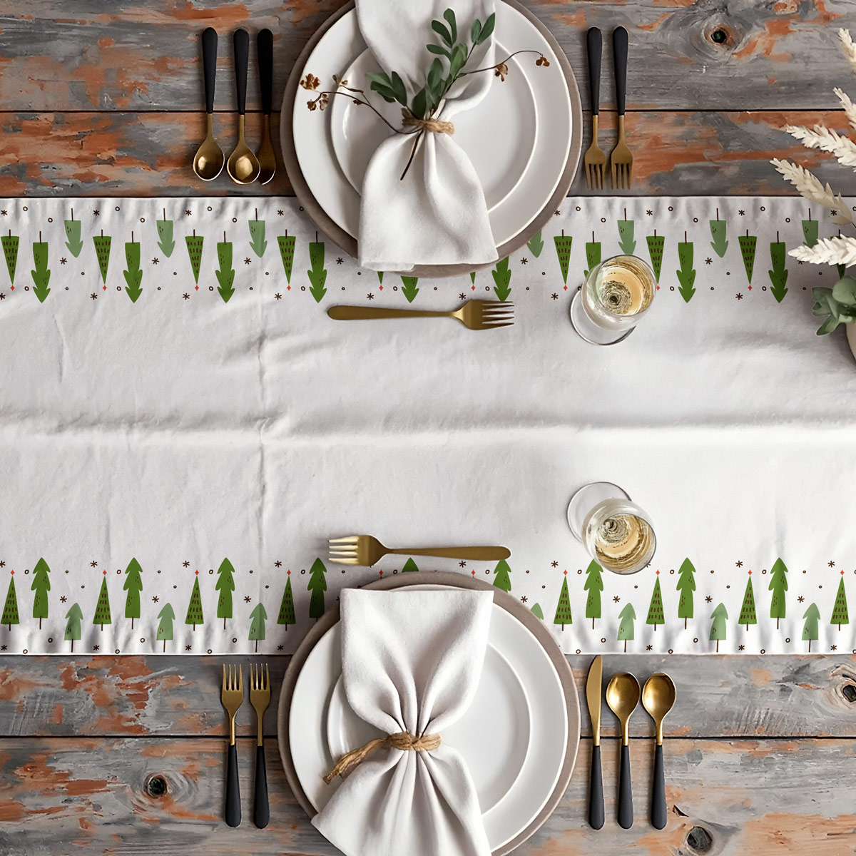 Elegancki, jasny bieżnik świąteczny ozdobiony zielonym wzorem choinek to idealny sposób, aby nadać stołowi zimowego charakteru. Delikatna grafika rozmieszczona wzdłuż krawędzi tworzy efektowną, a jednocześnie subtelną dekorację, która pasuje zarówno do wnętrz klasycznych, jak i nowoczesnych.