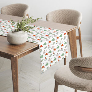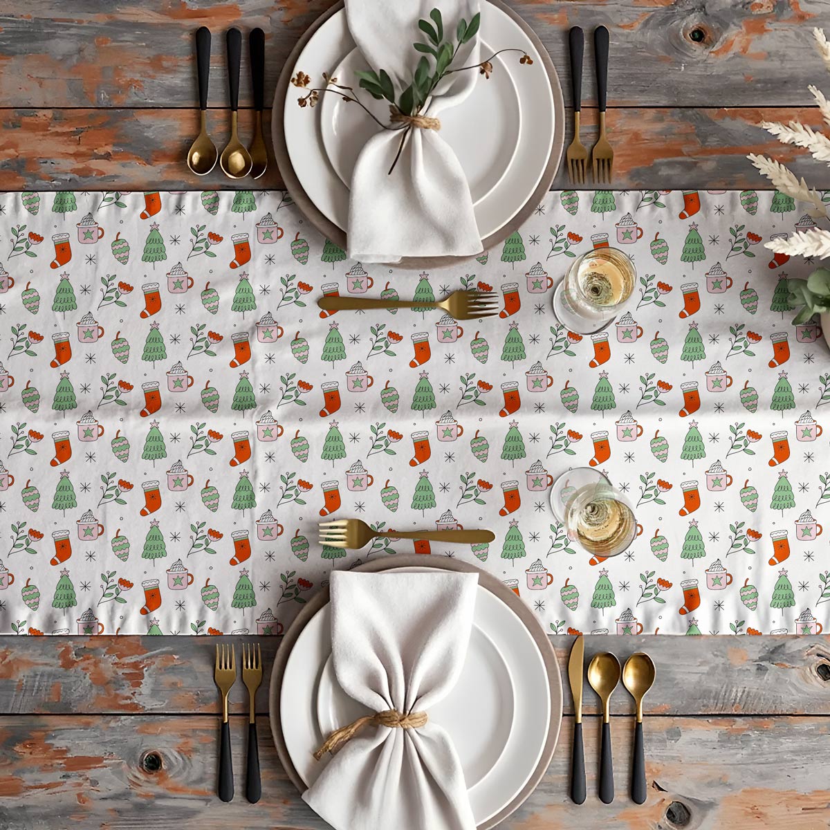 Uroczy bieżnik świąteczny w białym kolorze z pastelowym wzorem choinek, kubków i zimowych motywów. Idealny do stworzenia przytulnej, świątecznej atmosfery w kuchni lub jadalni.