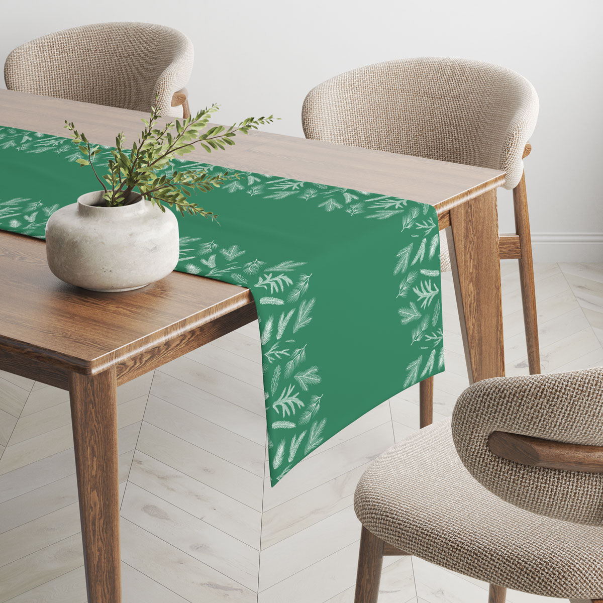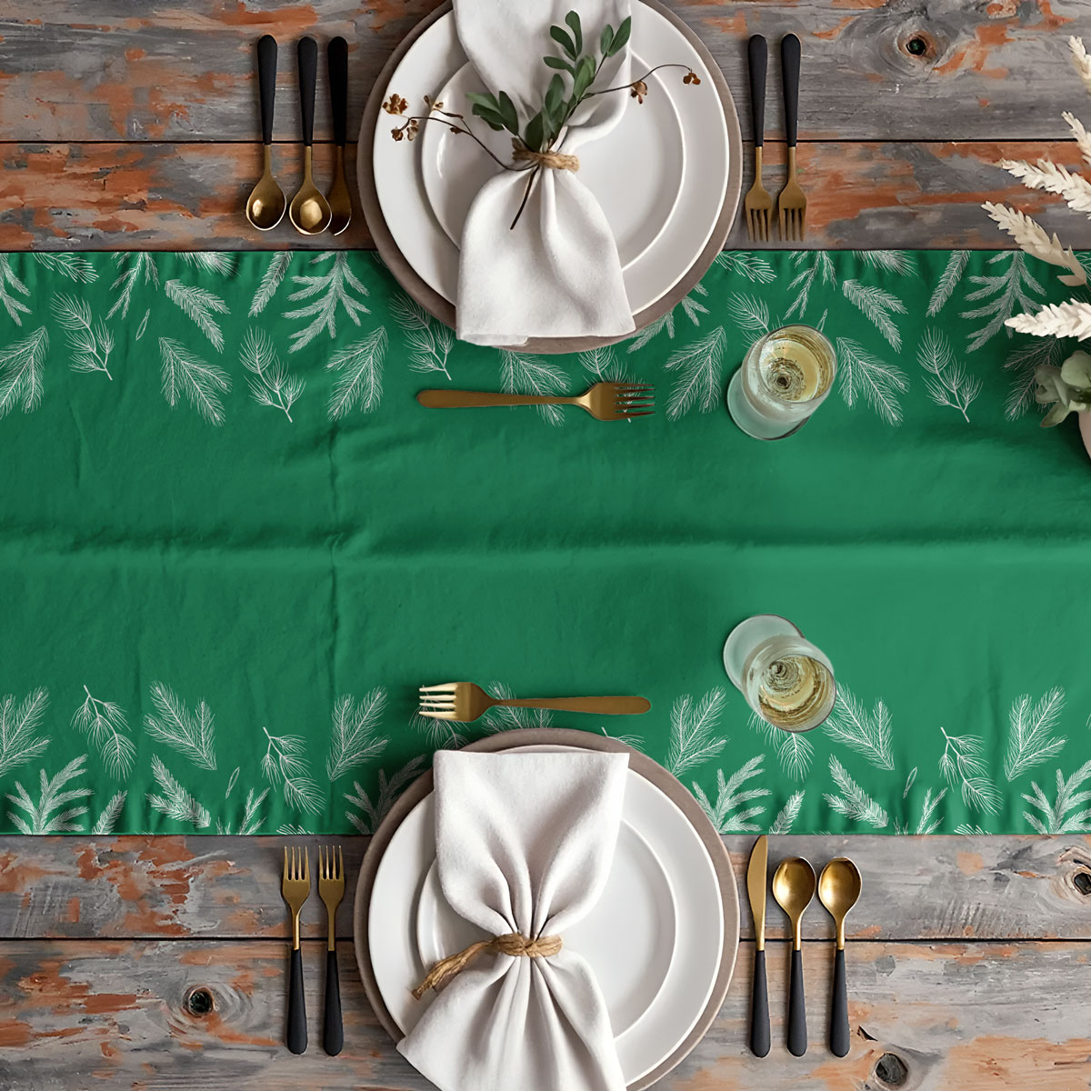 Stylowy bieżnik świąteczny w butelkowej zieleni, ozdobiony subtelnym motywem białych iglastych gałązek. Elegancki, naturalny i ponadczasowy — idealny na świąteczne kolacje i zimowe dekoracje stołu.