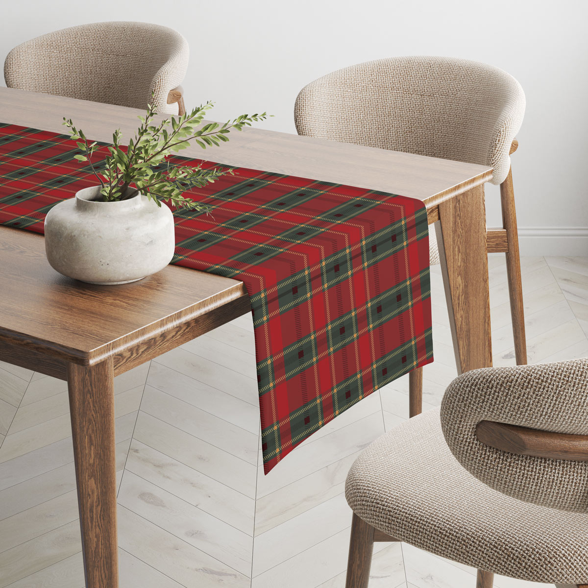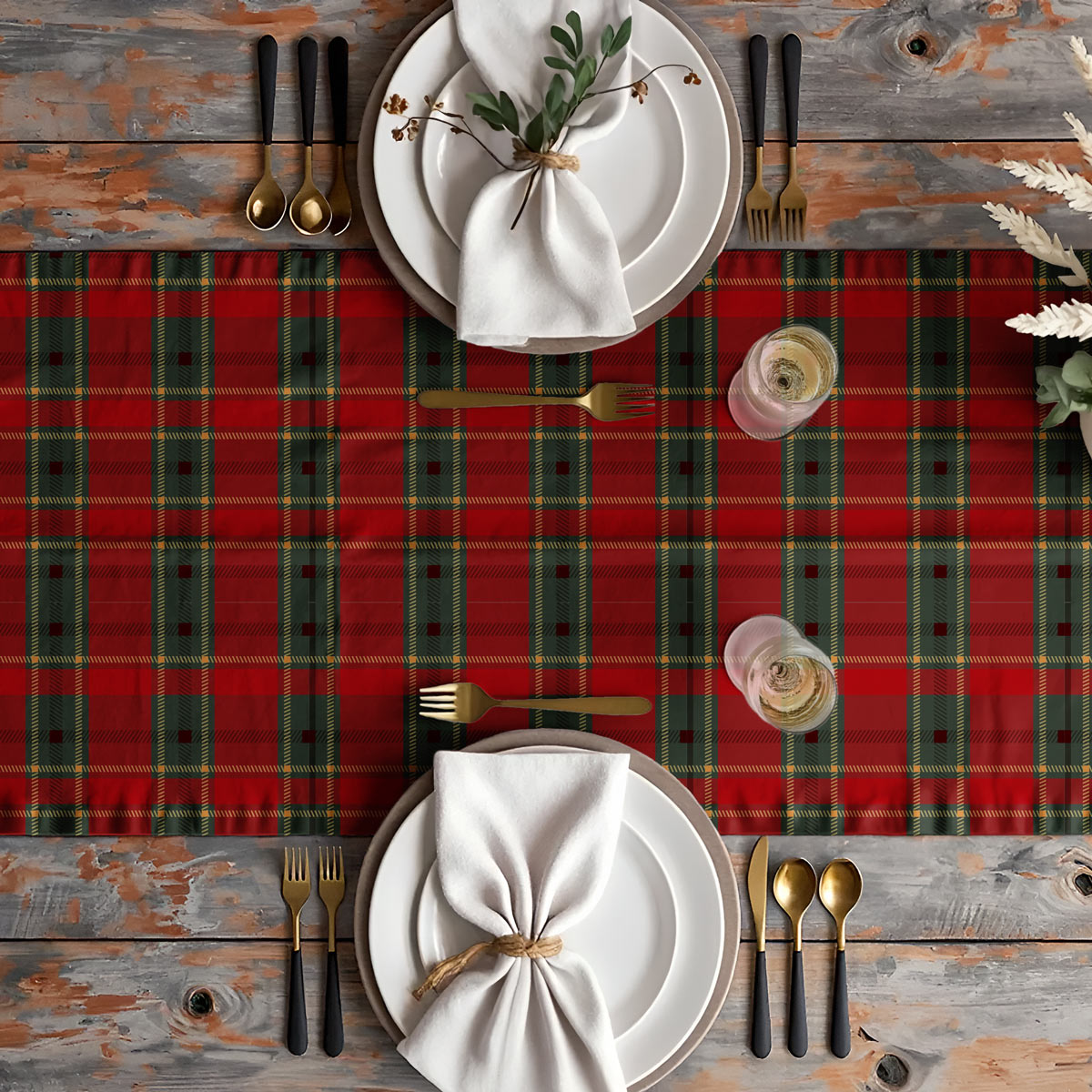 Klasyczny i stylowy bieżnik świąteczny w czerwonej kracie szkockiej z eleganckimi zielonymi akcentami to idealny wybór dla osób, które cenią tradycyjne dekoracje bożonarodzeniowe.