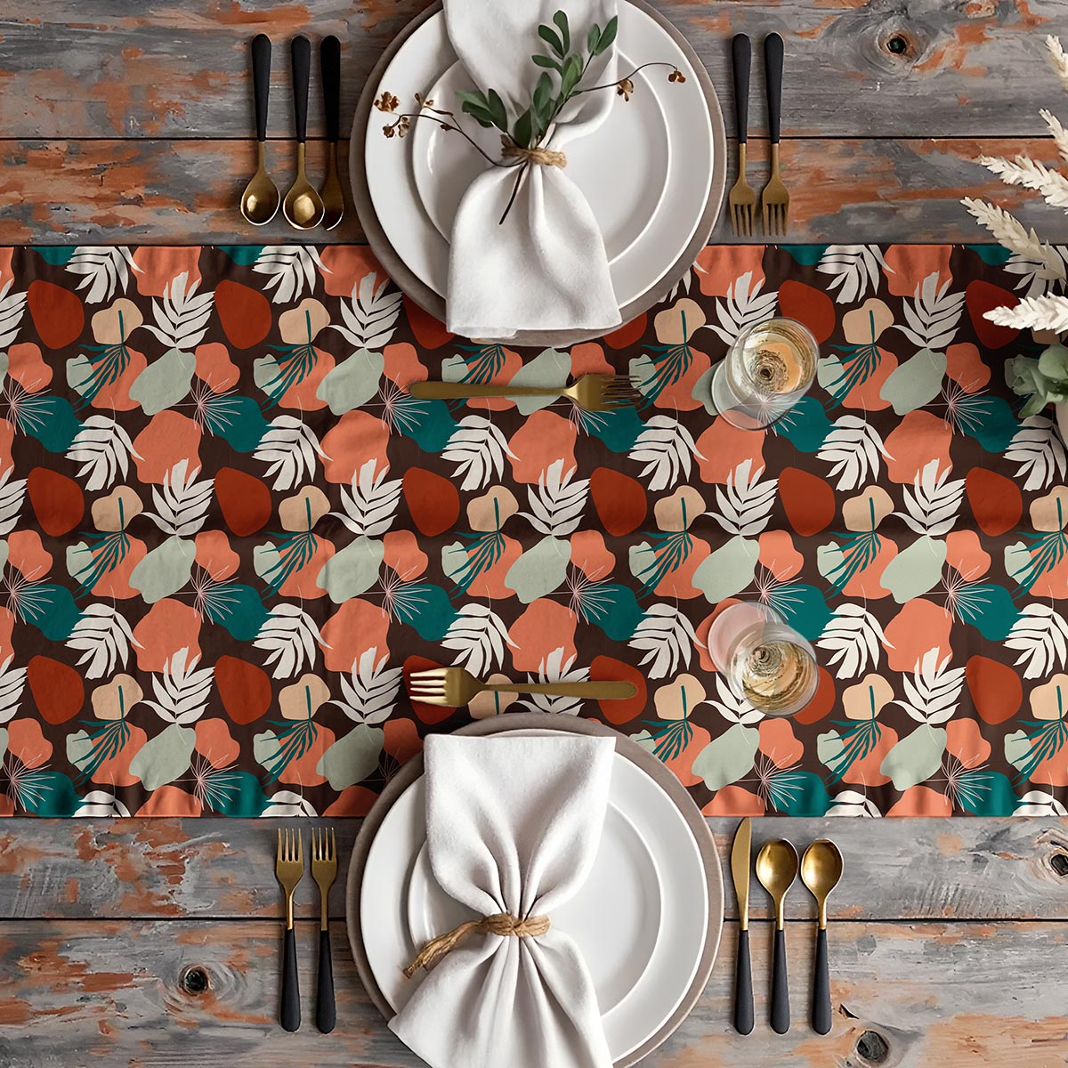 Dekoracyjny bieżnik łączy delikatne liście z miękkimi, nieregularnymi plamami, tworząc przytulny, naturalny wzór. Idealny do codziennych aranżacji oraz na specjalne okazje, gdy chcesz dodać stołowi osobistego charakteru.