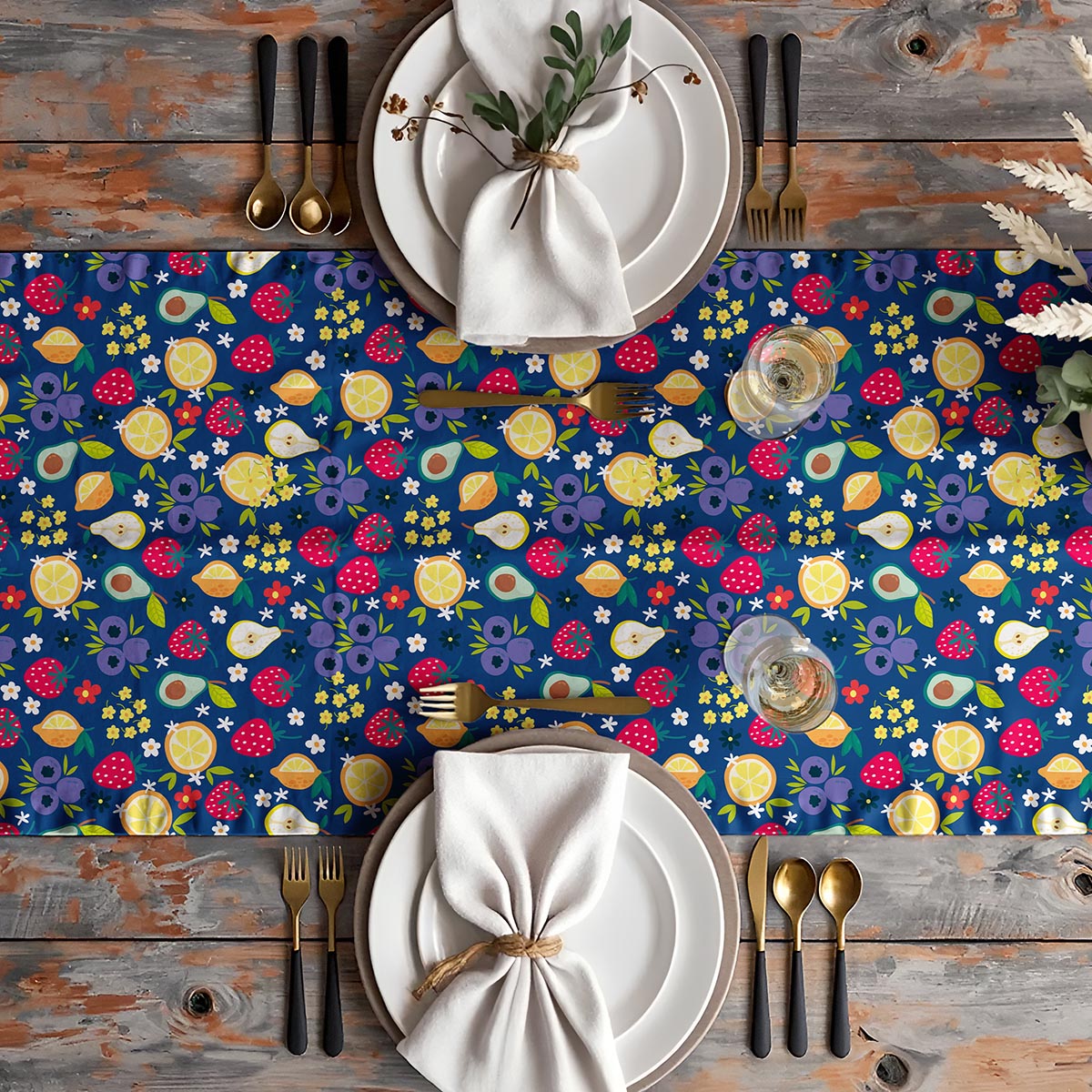 Ten bieżnik prezentuje wesoły, powtarzalny wzór z truskawkami, cytrynami, gruszkami, jagodami i drobnymi kwiatami na głębokim granatowym tle. Kolorowy motyw wnosi energię i radosny akcent do aranżacji stołu, zachowując przy tym elegancki kontrast dzięki ciemnej bazie.
