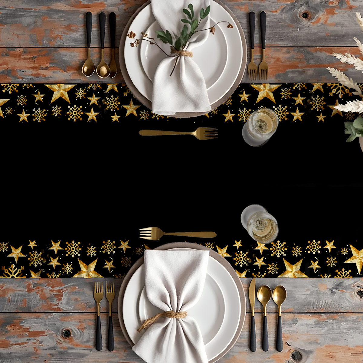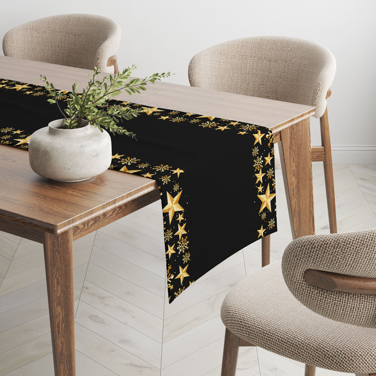 Wytworny i elegancki bieżnik świąteczny w głębokiej czerni, zdobiony złotymi gwiazdkami oraz delikatnymi śnieżynkami, tworzy wyjątkowo szykowną aranżację stołu. Połyskujące elementy nadają dekoracji luksusowego charakteru i pięknie podkreślają klimat Bożego Narodzenia.