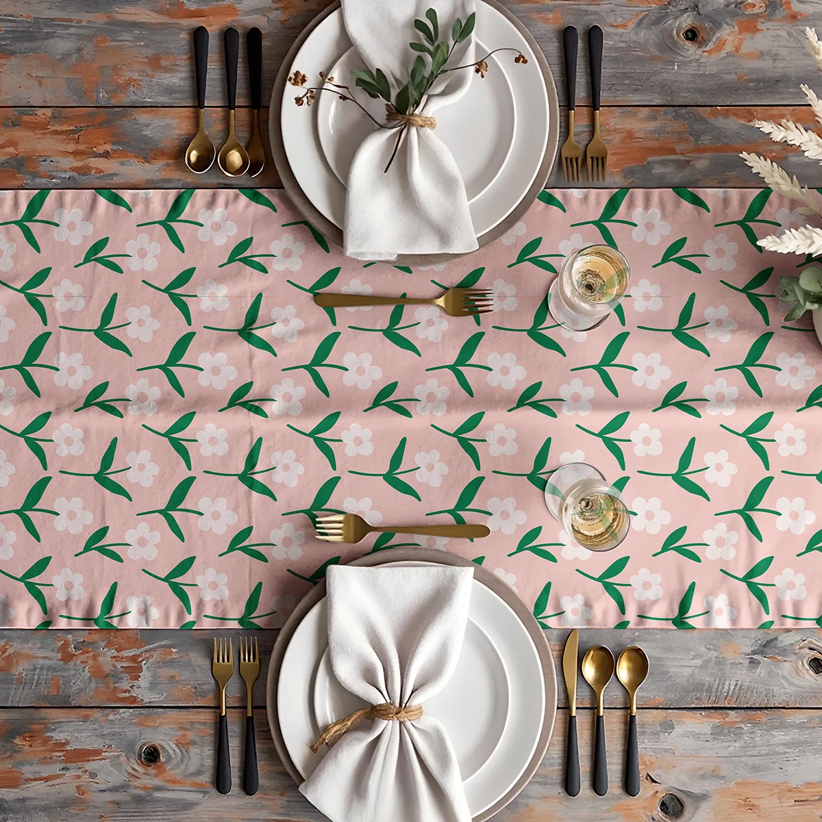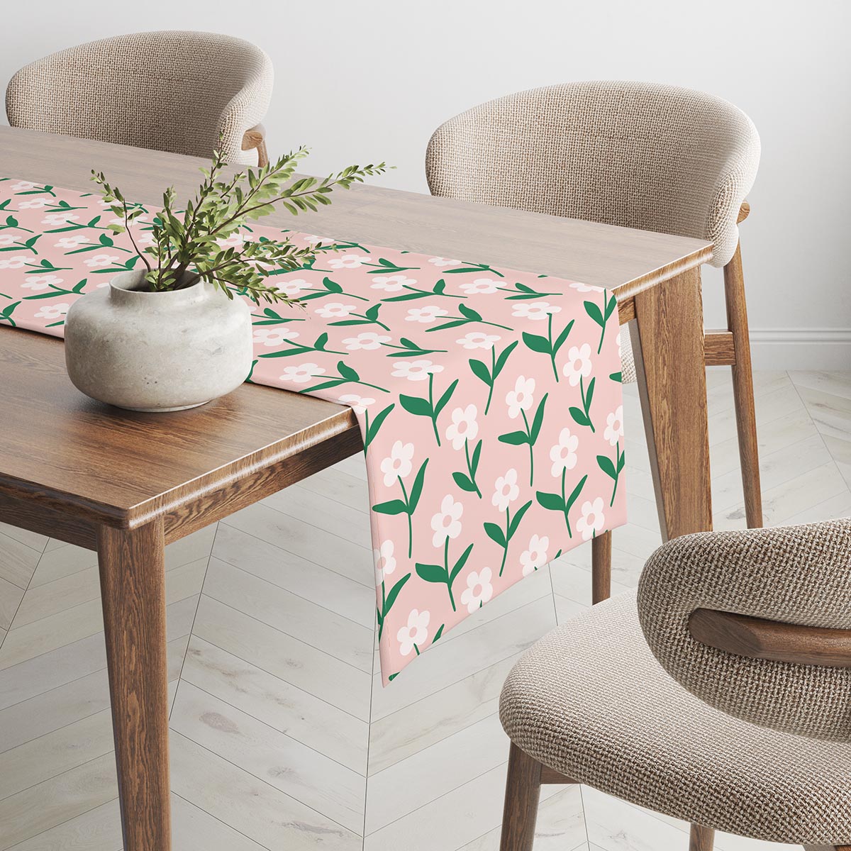 Ten bieżnik prezentuje powtarzalny, lekko retro wzór drobnych białych kwiatków na miękkim różowym tle z zielonymi listkami, który nadaje aranżacji świeżości i subtelnej elegancji. Motyw jest pogodny i uniwersalny, idealny do wnętrz w stylu skandynawskim, boho czy cottagecore. Materiał ma przyjemną, tekstylną fakturę i trwały, nasycony nadruk, dzięki czemu wzór zachowuje intensywność kolorów podczas używania.