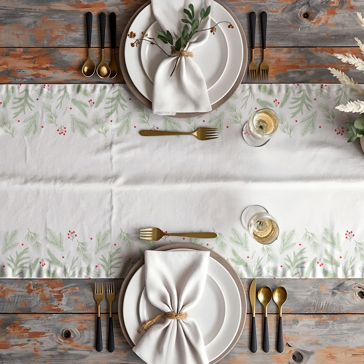 Stylowy i naturalny bieżnik świąteczny w białym odcieniu, ozdobiony subtelnym wzorem zimowych gałązek oraz czerwonych jagód. Delikatna kompozycja przywołuje atmosferę świąt, tworząc elegancką, przytulną i harmonijną dekorację stołu.