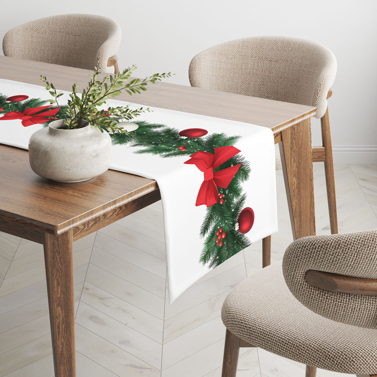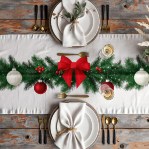 Stylowy i elegancki bieżnik świąteczny w białym kolorze ozdobiony dekoracyjną girlandą z zielonego igliwia. Czerwone kokardy, bombki i drobne ozdoby nadają mu wyjątkowego, tradycyjnego charakteru.