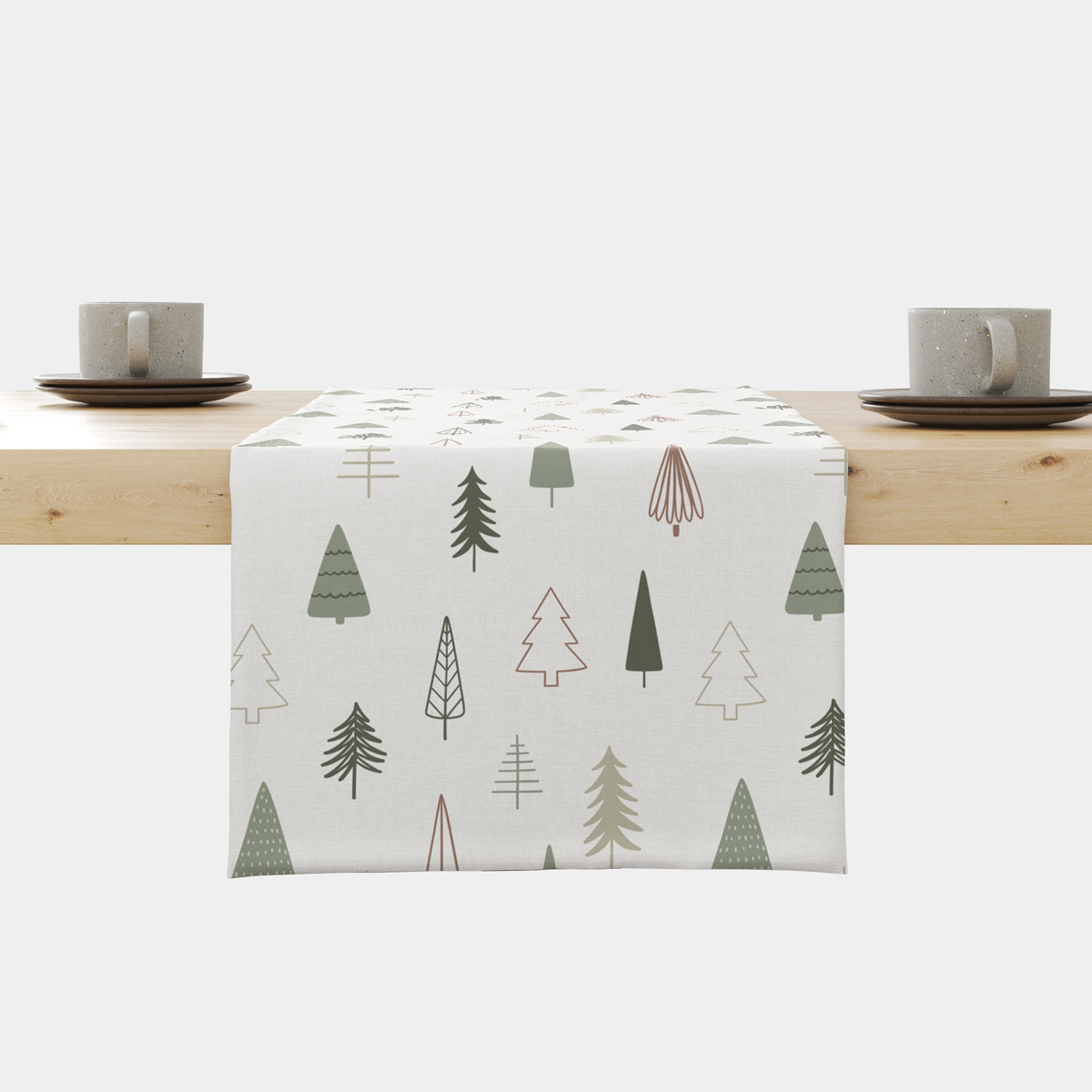 Biały bieżnik świąteczny z uroczym motywem choinek w odcieniach zieleni i beżu. Subtelny, lekki wzór tworzy przytulną, zimową atmosferę i doskonale komponuje się z naturalnymi dekoracjami stołu.