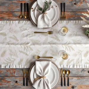 Stylowy i elegancki bieżnik świąteczny w kremowym kolorze, ozdobiony delikatnym, złotobeżowym motywem gałązek iglastych. Subtelny wzór tworzy wyjątkowy, naturalny klimat – idealny na świąteczne dekoracje stołu w stylu klasycznym, skandynawskim lub boho.