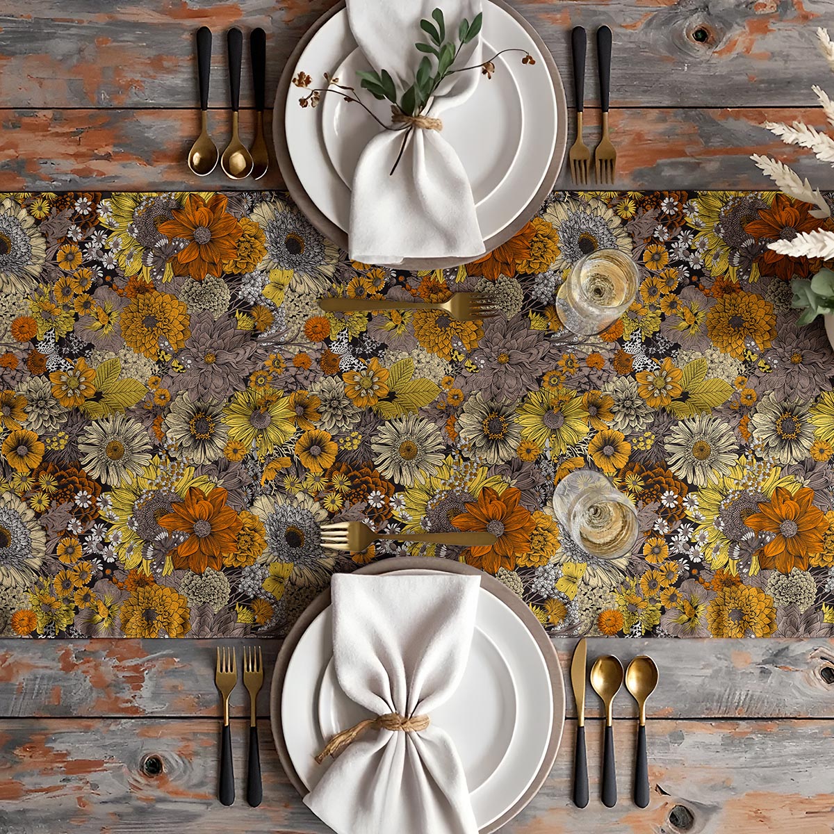 Dekoracyjny bieżnik z gęstym, ręcznie rysowanym motywem kwiatowym w ciepłych, jesiennych barwach. Idealny do stołu codziennego i odświętnego, dodaje wnętrzu przytulnego charakteru.