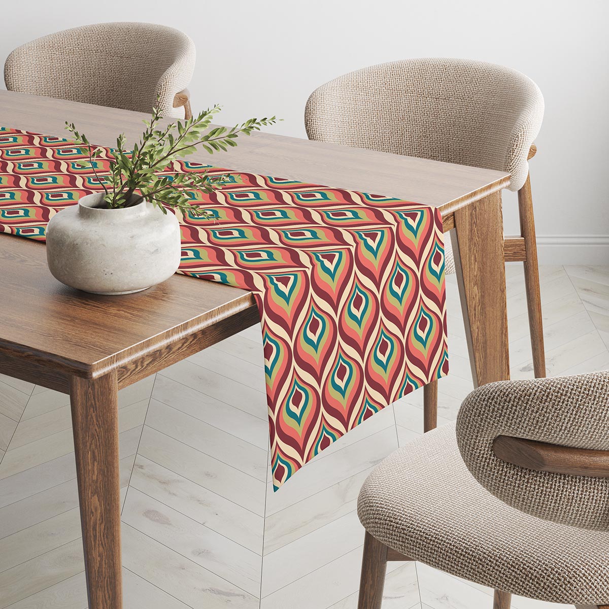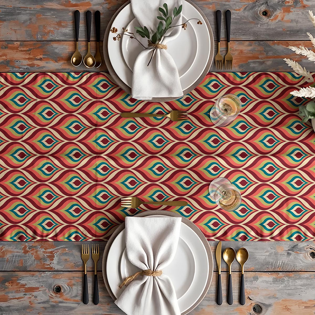 Ten bieżnik prezentuje geometryczny, powtarzalny motyw łezek w palecie ciepłych, nasyconych barw, który natychmiast przyciąga wzrok. Wzór nawiązuje do lat 60. i 70., dodając wnętrzu nostalgicznego, ale świeżego charakteru.