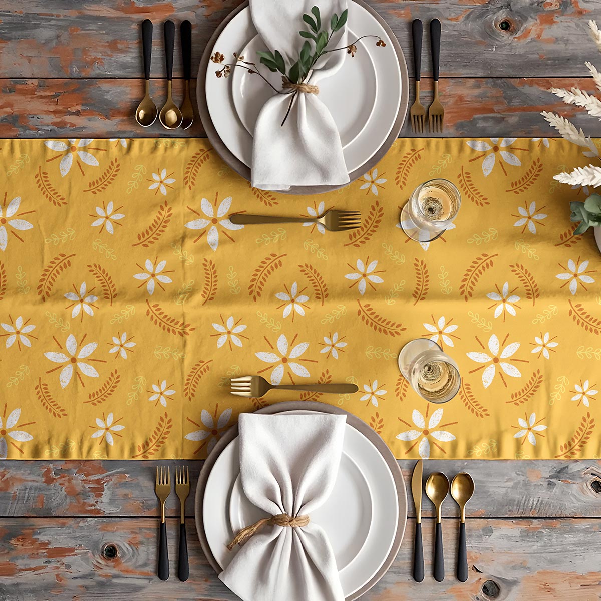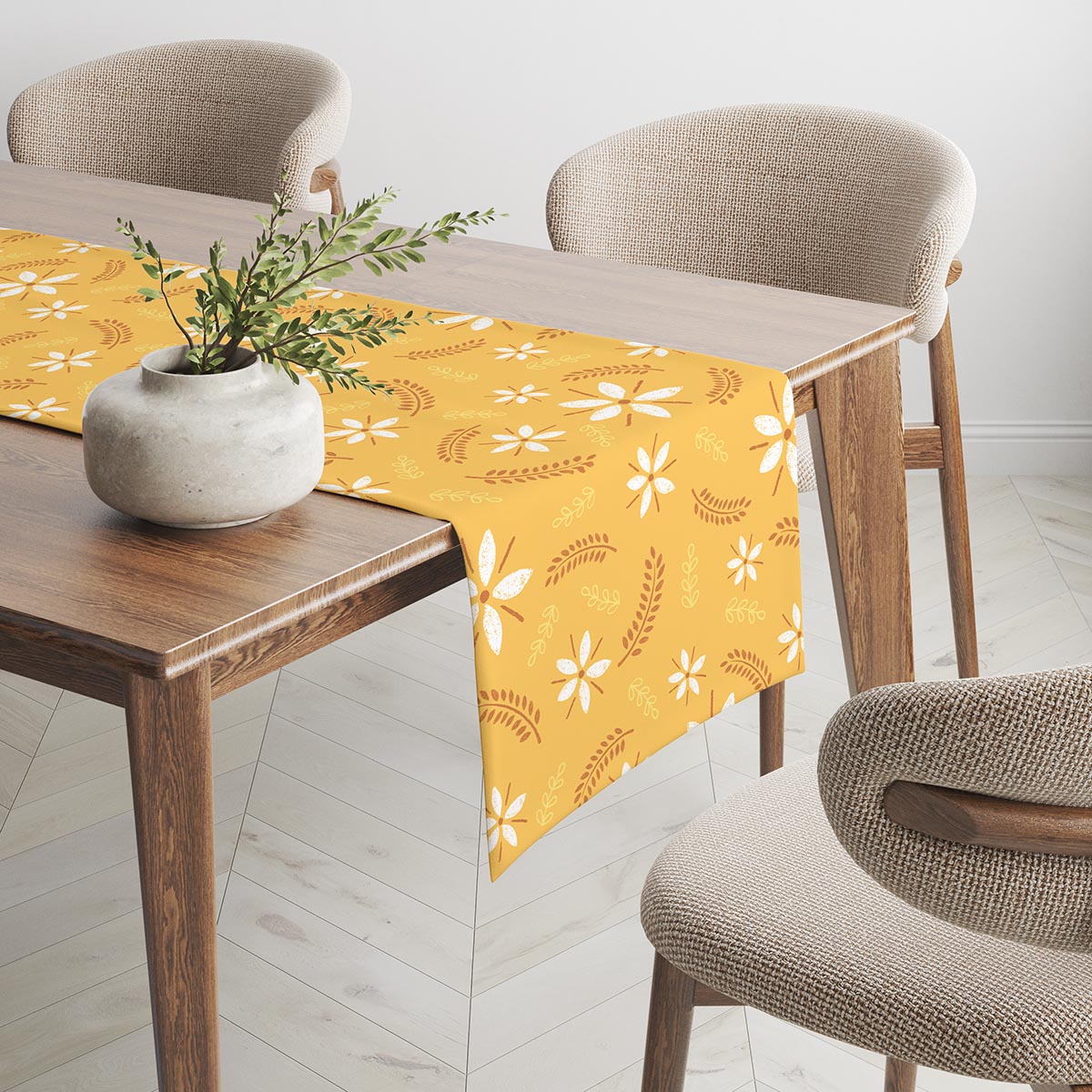 Bieżnik prezentuje subtelny motyw stylizowanych, białych kwiatów i drobnych listków na ciepłym, musztardowym tle. Wzór jest lekki i pogodny, dlatego doskonale ożywi zarówno nowoczesne, jak i rustykalne aranżacje stołu.