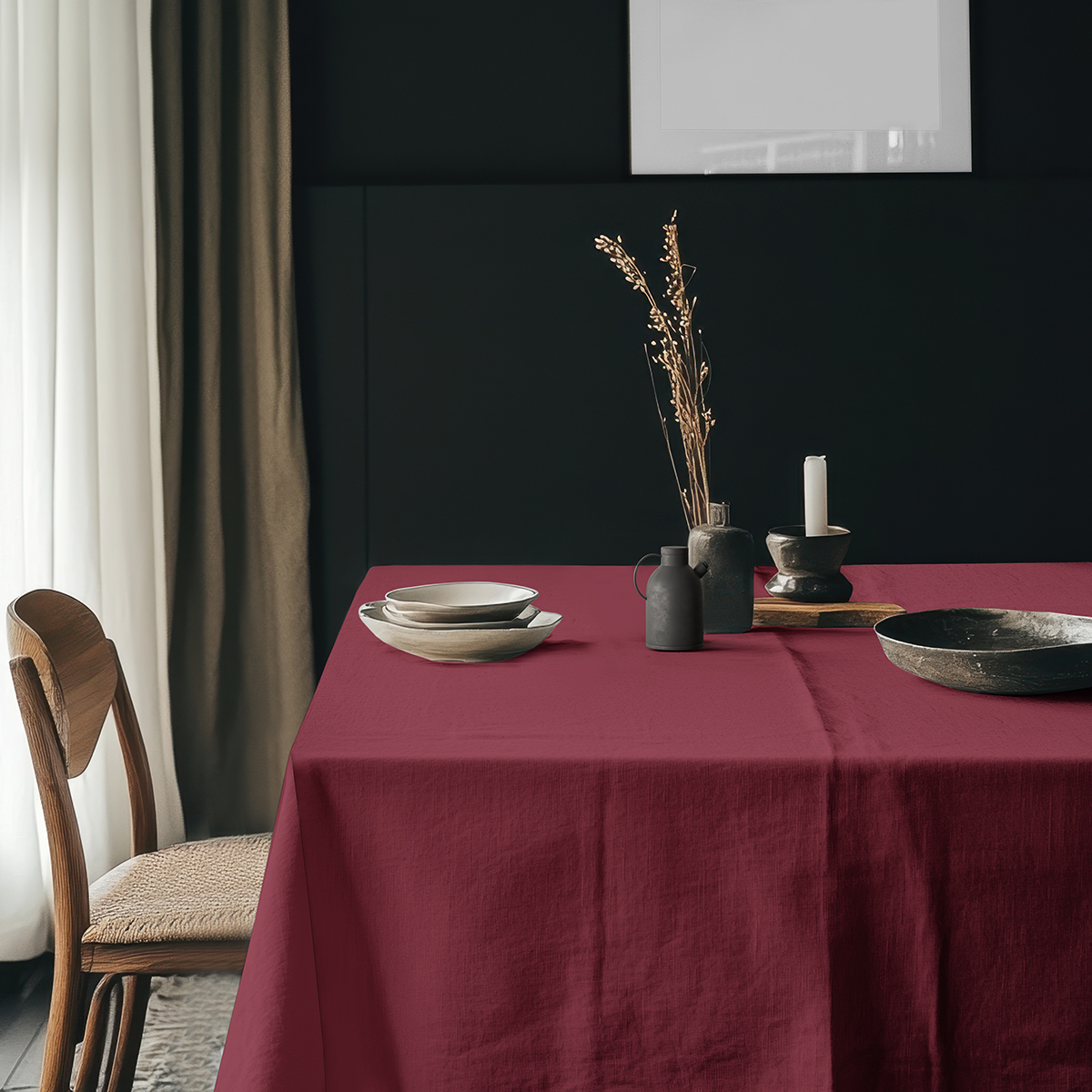 Ten obrus o jednolitej, głębokiej barwie podkreśla charakter stołu, dodając wnętrzu wyrafinowanej prostoty. Gładka powierzchnia i równomierne wykończenie tworzą neutralne tło, dzięki któremu dekoracje stołu zyskują bardziej elegancką oprawę.