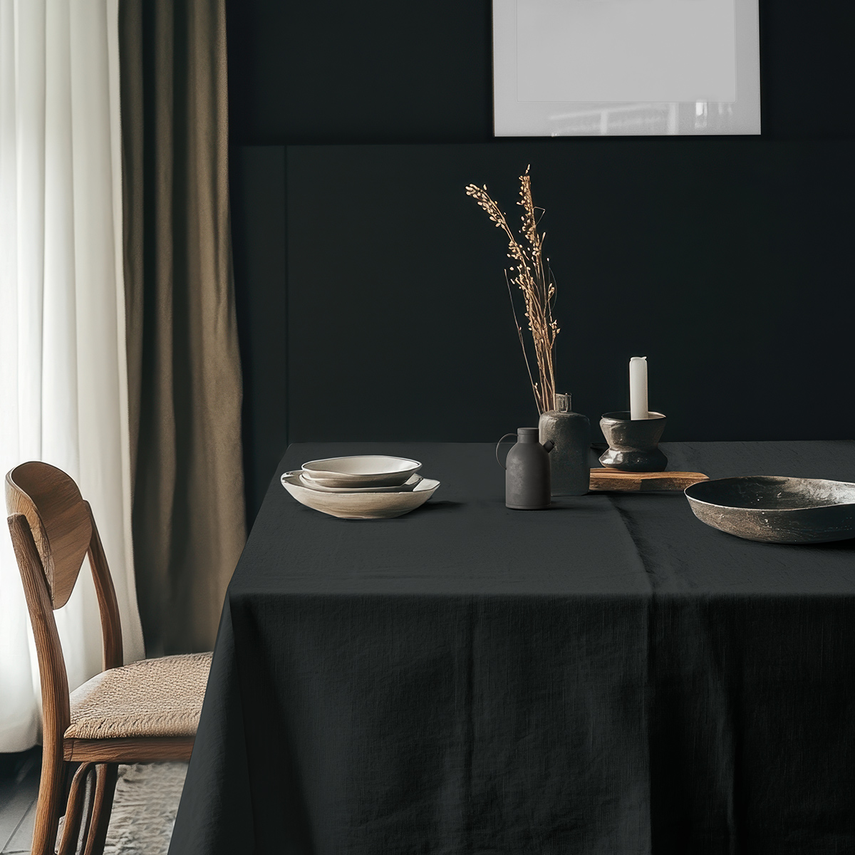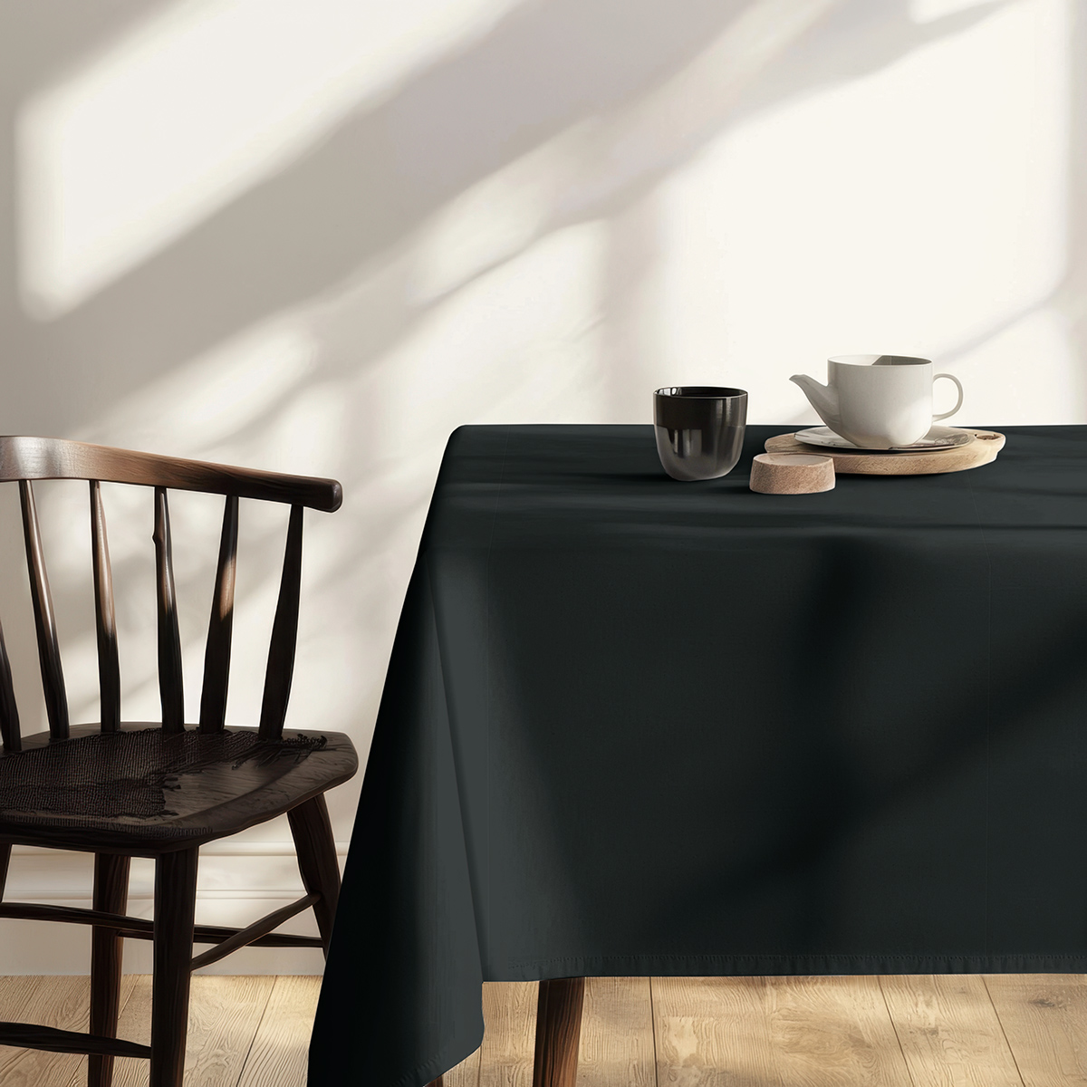 Gładki czarny obrus wnosi do wnętrza subtelny, a zarazem wyrazisty charakter, tworząc eleganckie tło dla zastawy i dekoracji.