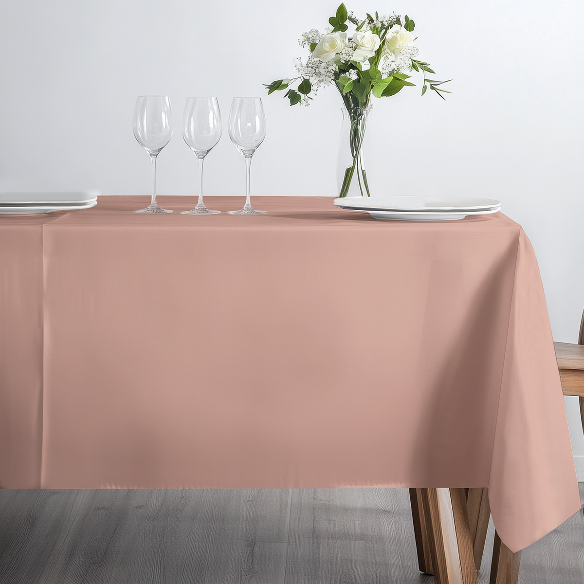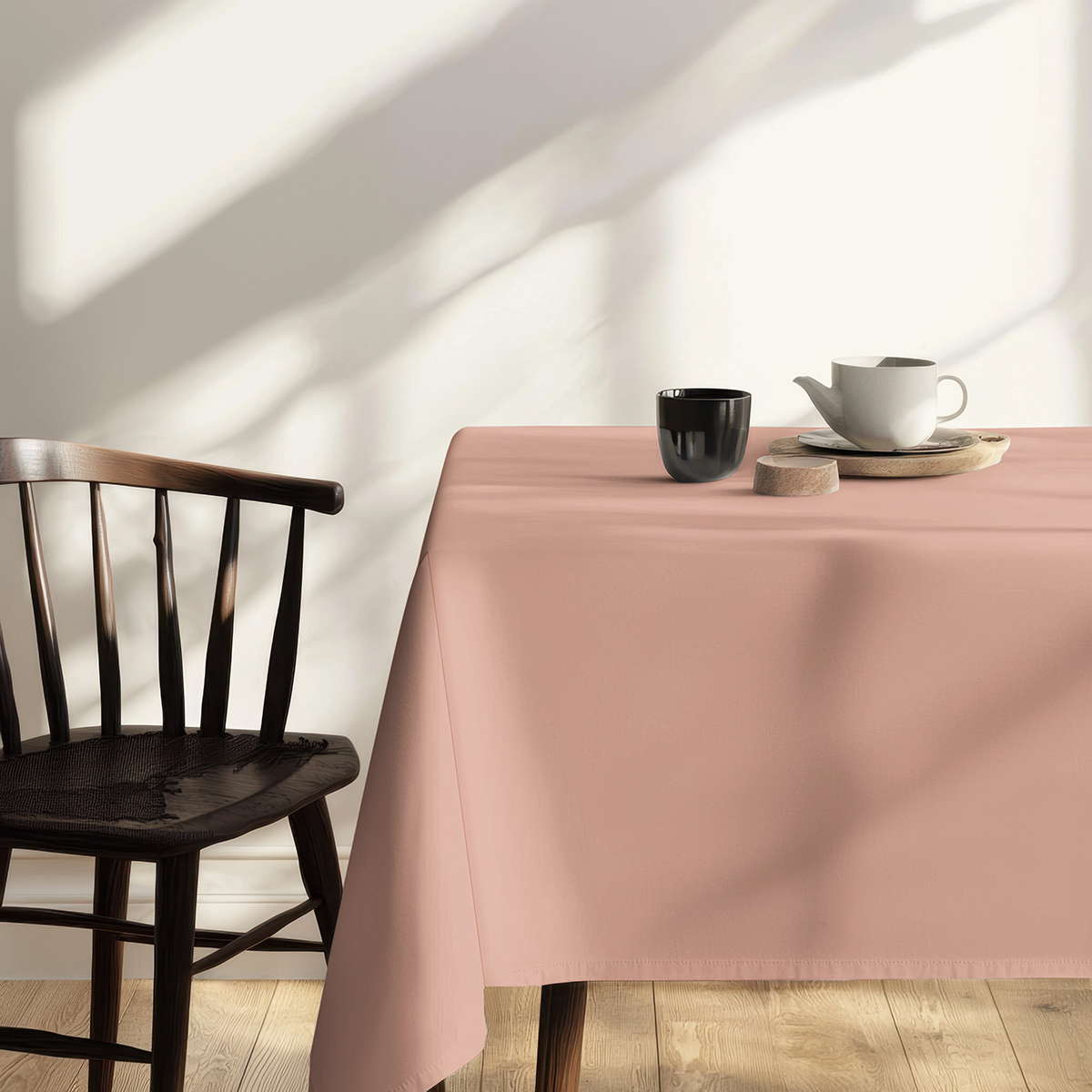 Gładki obrus w stonowanym różowym odcieniu, który subtelnie ociepla aranżację stołu. Wykonany z przyjemnego w dotyku materiału, łatwy w pielęgnacji i odpowiedni zarówno na codzienne posiłki, jak i wizyty gości.