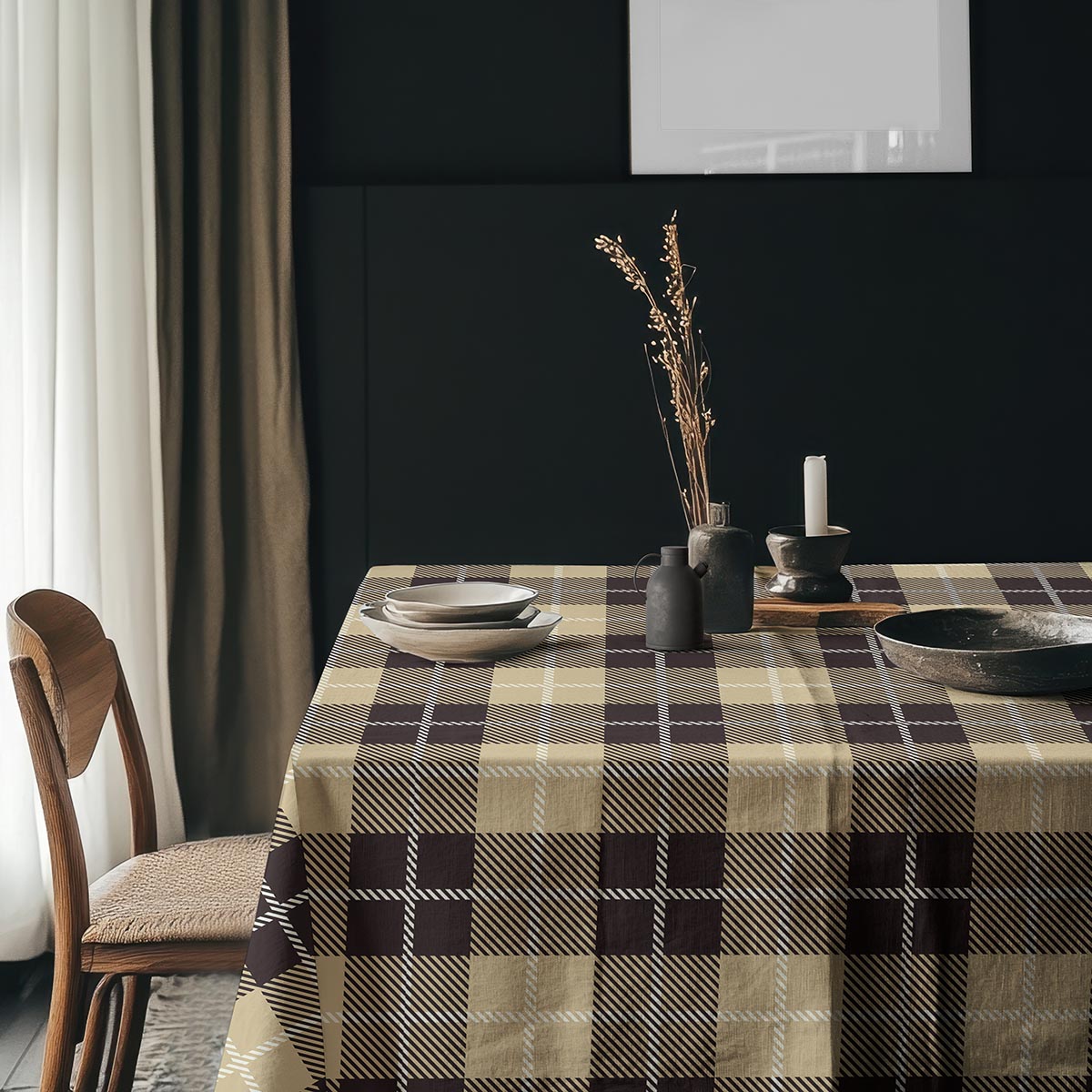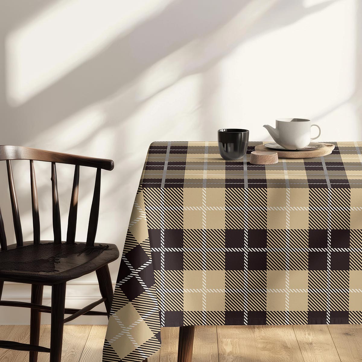 Ten obrus wyróżnia się dużą, geometryczną kratą w ciepłych odcieniach beżu i głębokiego brązu, przełamaną cienkimi, białymi liniami. Wzór łączy klasyczny motyw z nowoczesnym, skośnym cieniowaniem, co nadaje mu wyrazistości i elegancji.