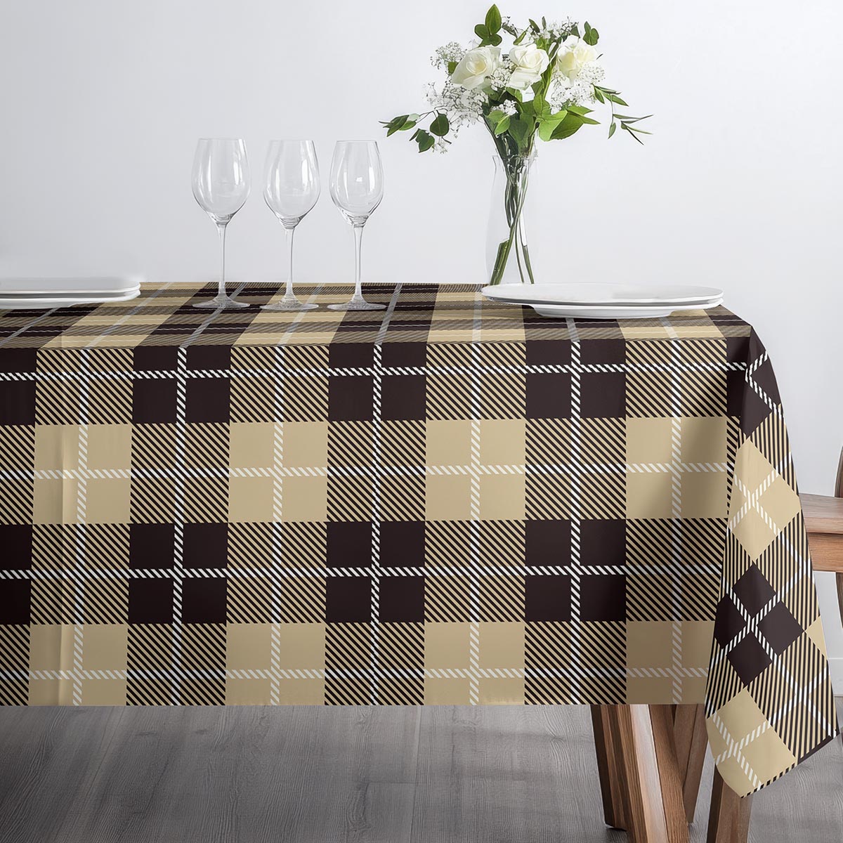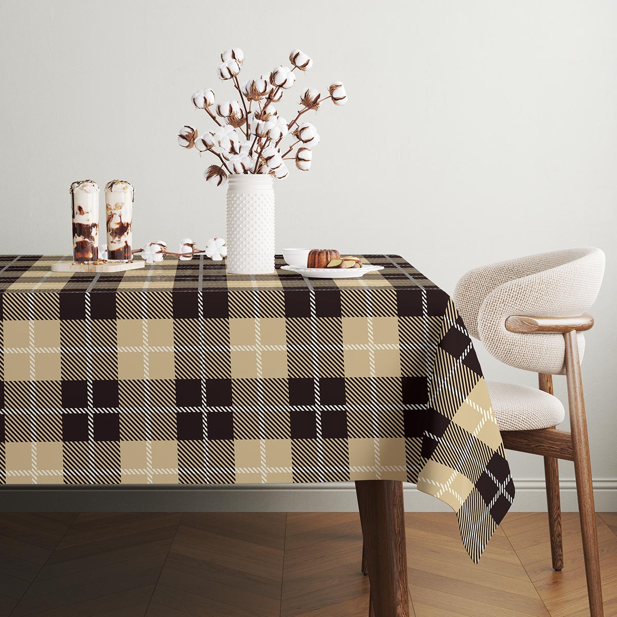 Uniwersalny obrus z subtelnym, kraciastym wzorem doda przytulnego charakteru każdemu stołowi. Stonowane beżowe i brązowe pola z delikatnymi, białymi akcentami sprawiają, że dekoracja pasuje do różnych wnętrz.
