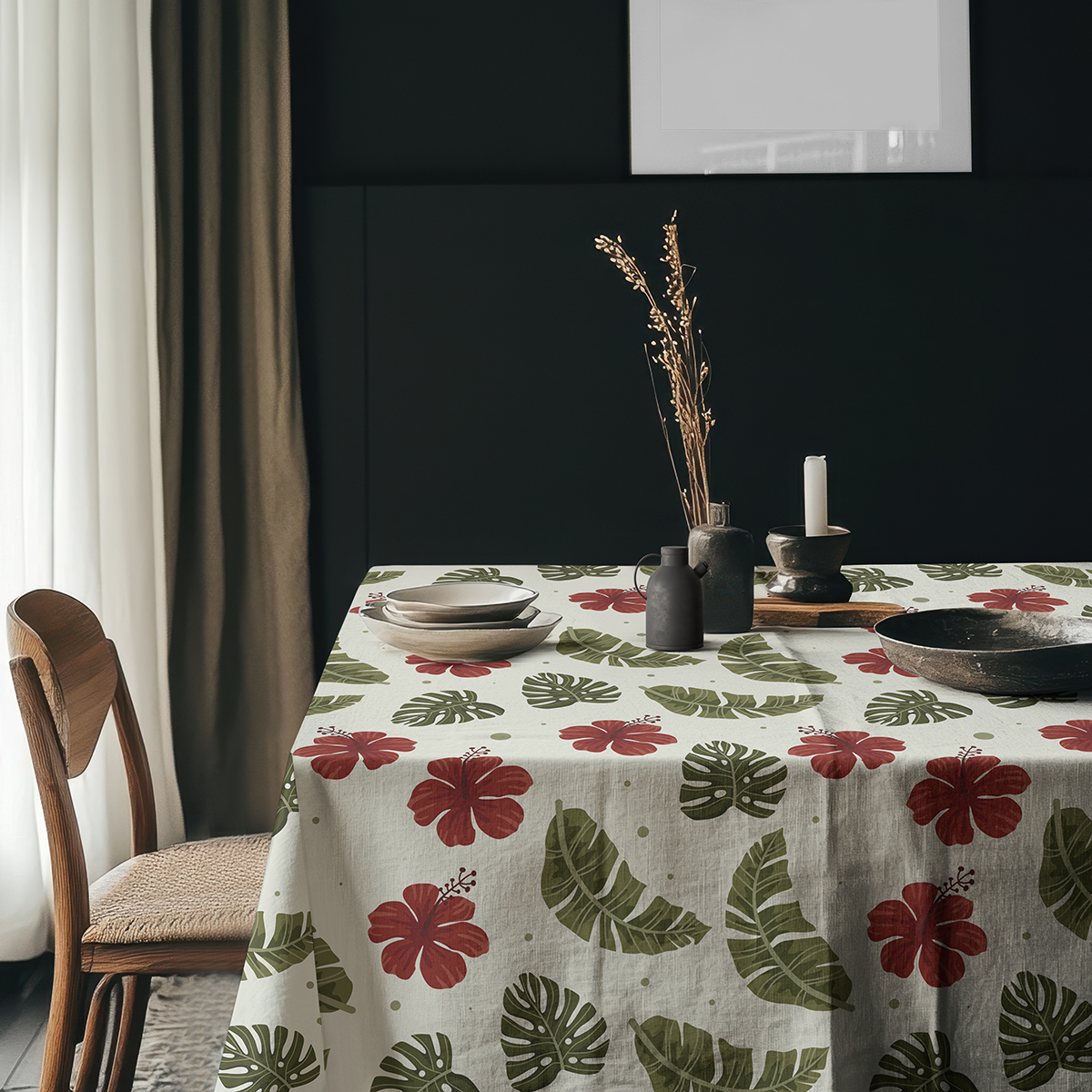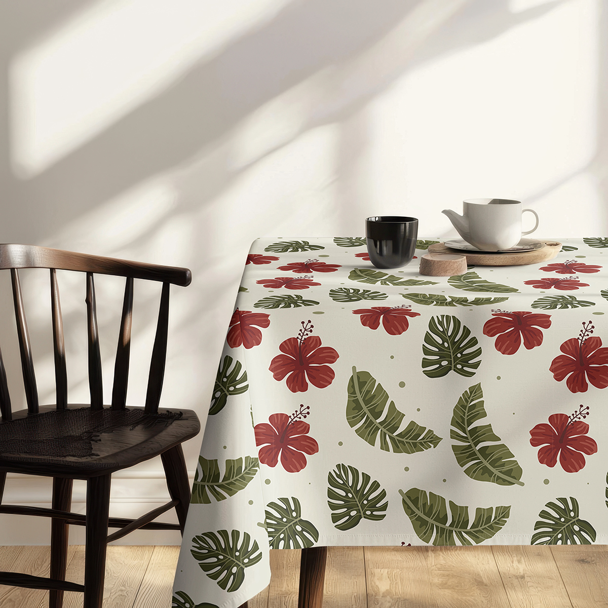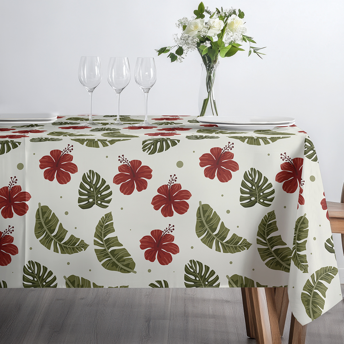 Dekoracyjny obrus z subtelnym kremowym tłem i wyrazistym wzorem czerwonych hibiskusów oraz zielonych liści. Świetnie sprawdzi się jako akcent w jadalni lub na tarasie, wprowadzając przyjemny, tropikalny klimat.