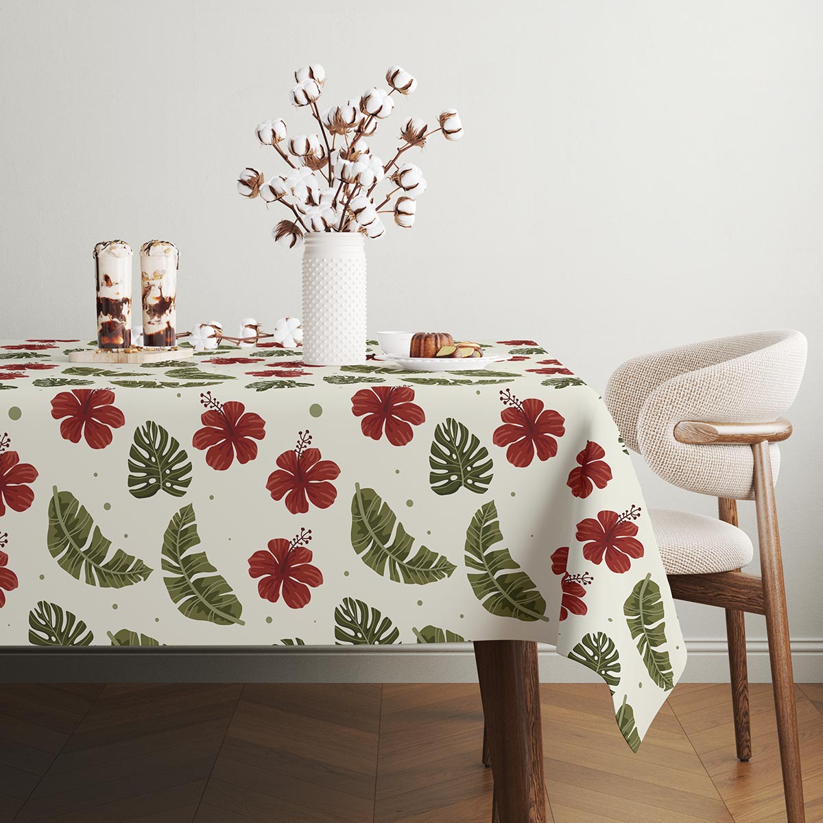 Ten obrus łączy w sobie delikatne, kremowe tło z żywym motywem czerwonych hibiskusów i różnych zielonych liści, tworząc lekki, a jednocześnie dekoracyjny wzór. Projekt inspirowany tropikalną roślinnością wprowadza do wnętrza świeżość i naturalny charakter, pasując zarówno do nowoczesnych, jak i rustykalnych aranżacji. Wykonany z przyjemnej w dotyku tkaniny, obrus prezentuje wyraźny nadruk i subtelną fakturę materiału, co widać także na zbliżeniach wzoru.