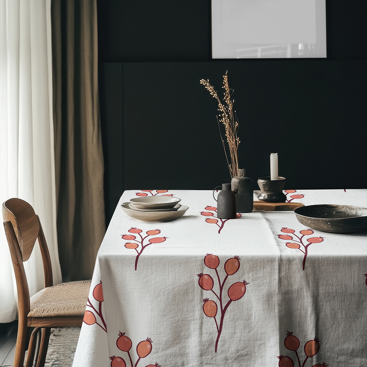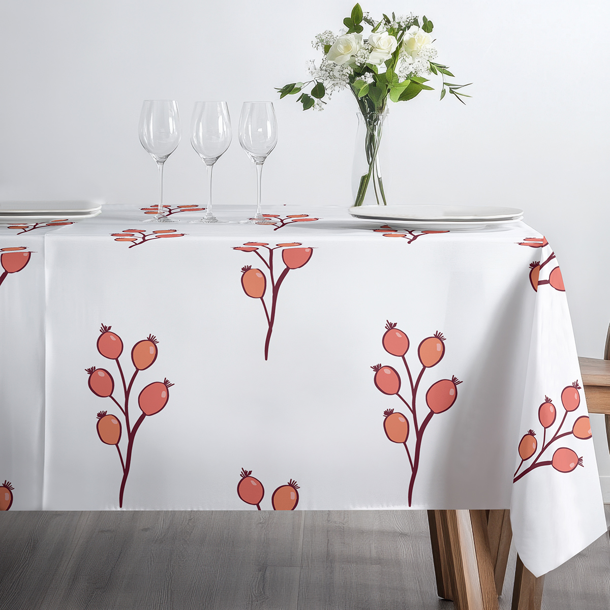 Minimalistyczny obrus z powtarzającym się motywem gałązek doda stołowi świeżości i przytulnego charakteru. Jasne tło subtelnie eksponuje koralowo-bordowe owoce, dzięki czemu wzór pasuje do różnych aranżacji.