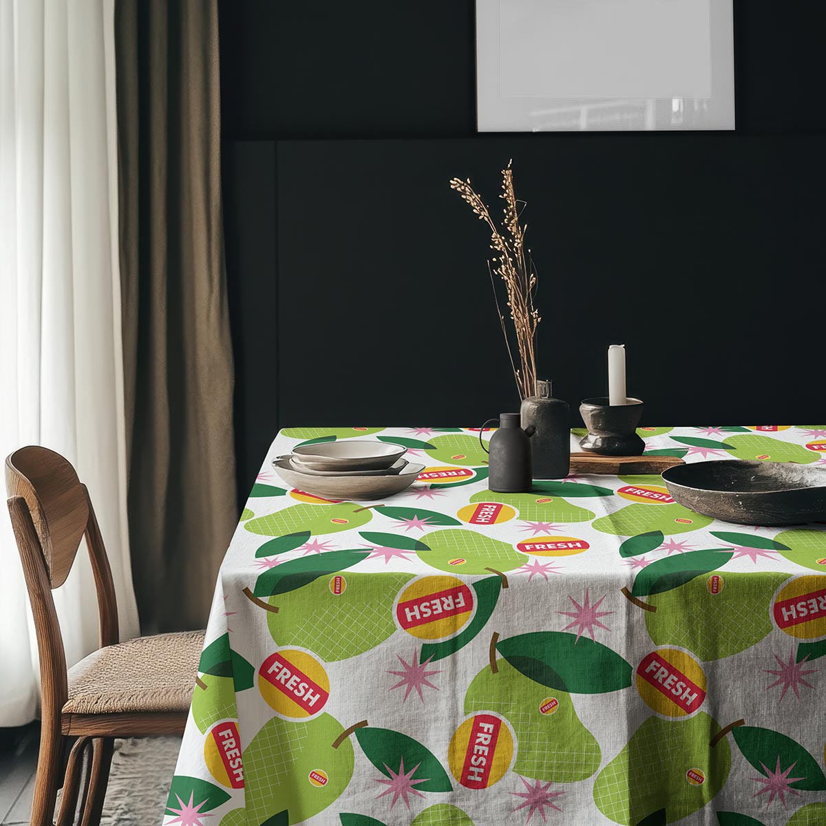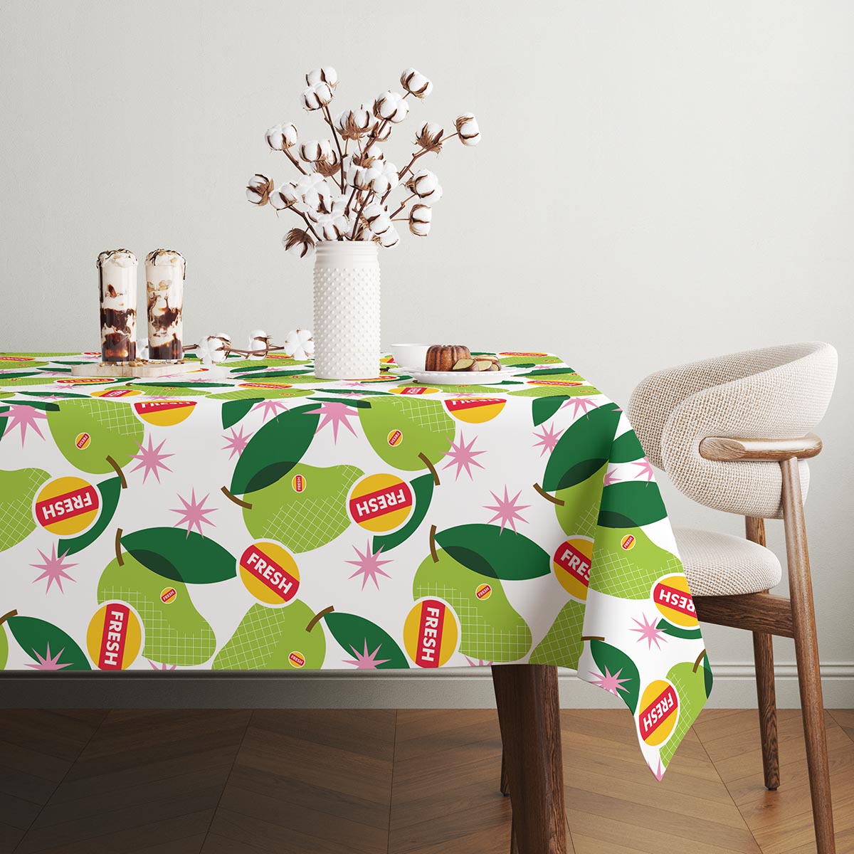 Kolorowy, pełen energii wzór z dużymi zielonymi gruszkami, zielonymi liśćmi i różowymi gwiazdkami tworzy radosną, nowoczesną aranżację stołu. Charakterystyczne znaczki „FRESH” dodają projektowi lekko humorystycznego, świeżego charakteru, który ożywi każde wnętrze.