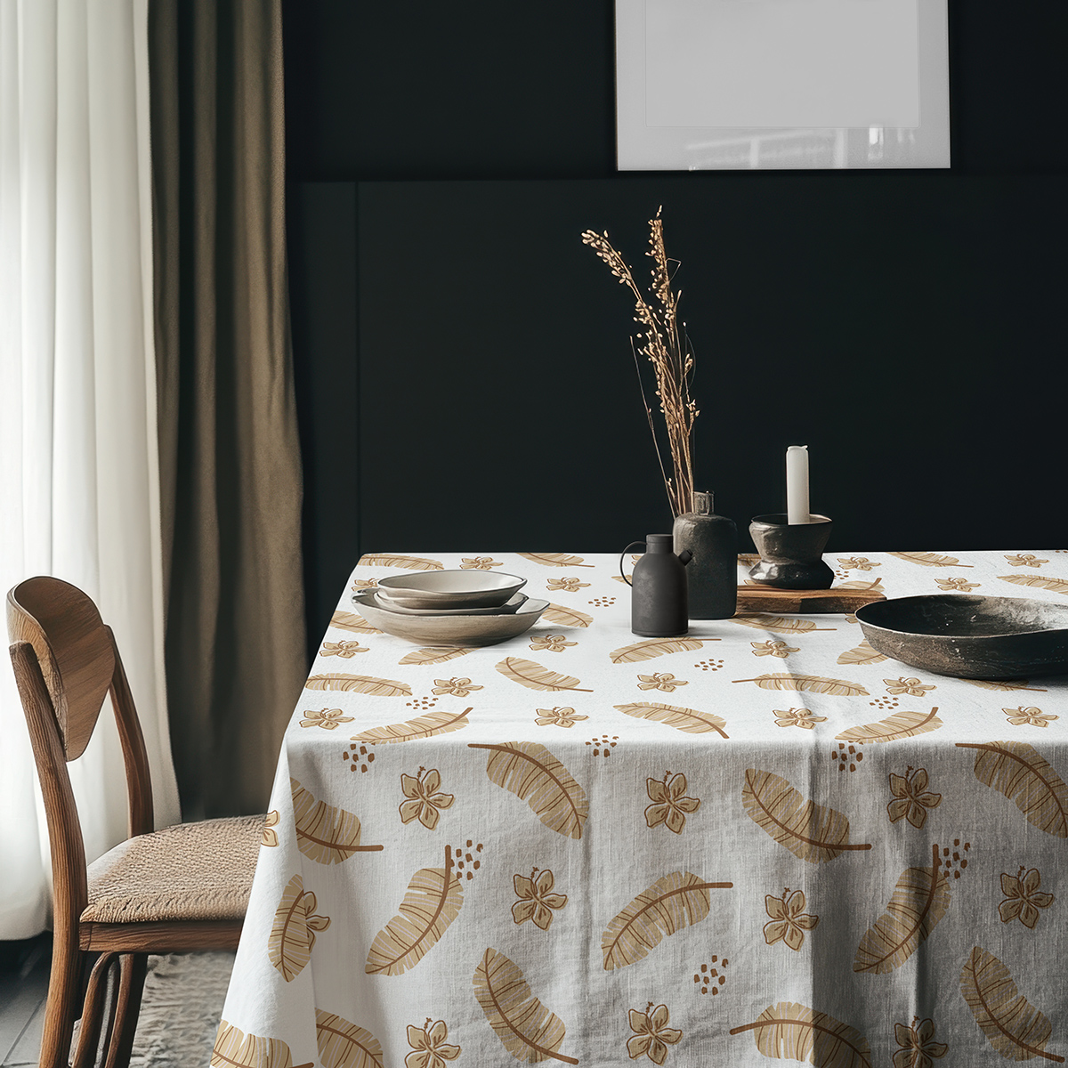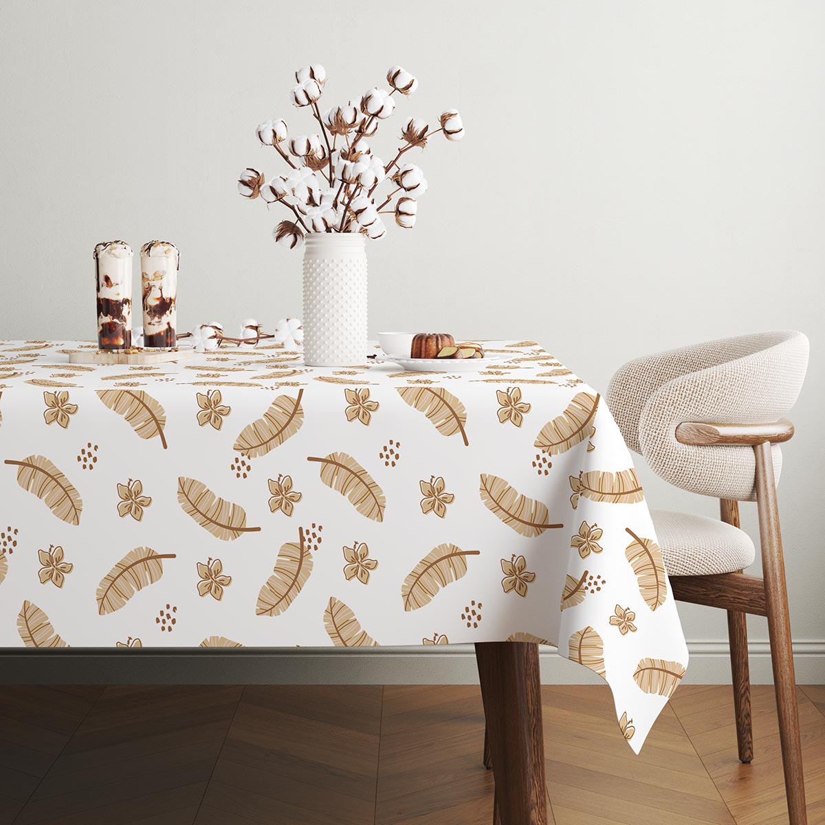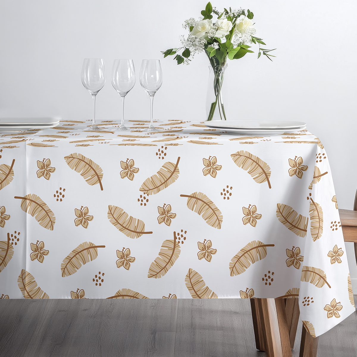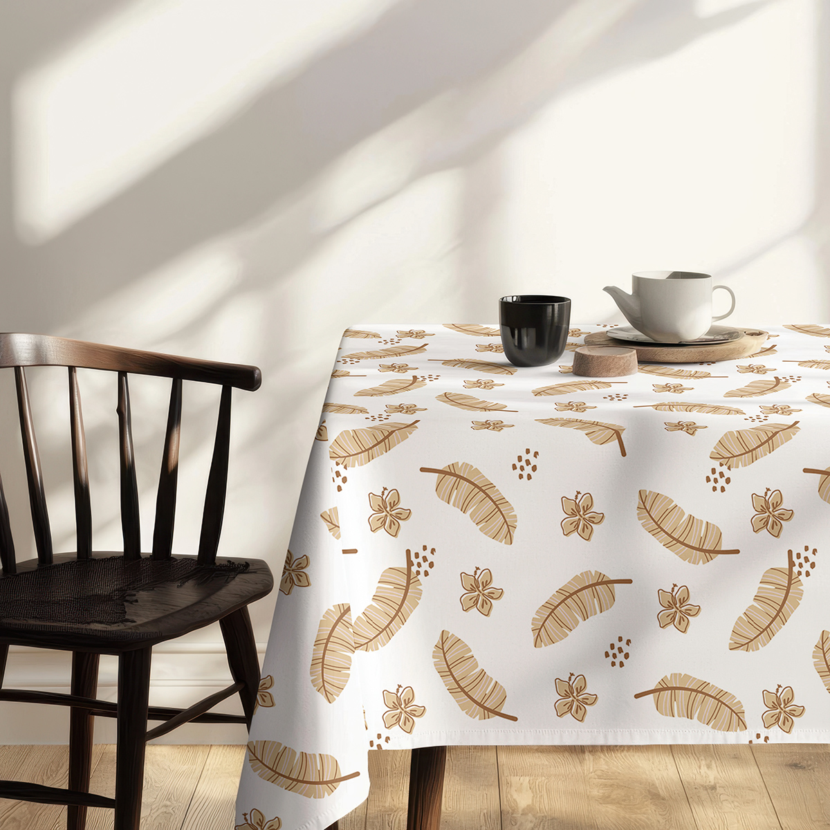 Ten obrus łączy subtelny, powtarzalny motyw piór z drobnymi kwiatowymi elementami w ciepłej, beżowo-brązowej tonacji. Wzór jest lekki i elegancki, dzięki czemu pasuje zarówno do nowoczesnych, jak i klasycznych aranżacji stołu.