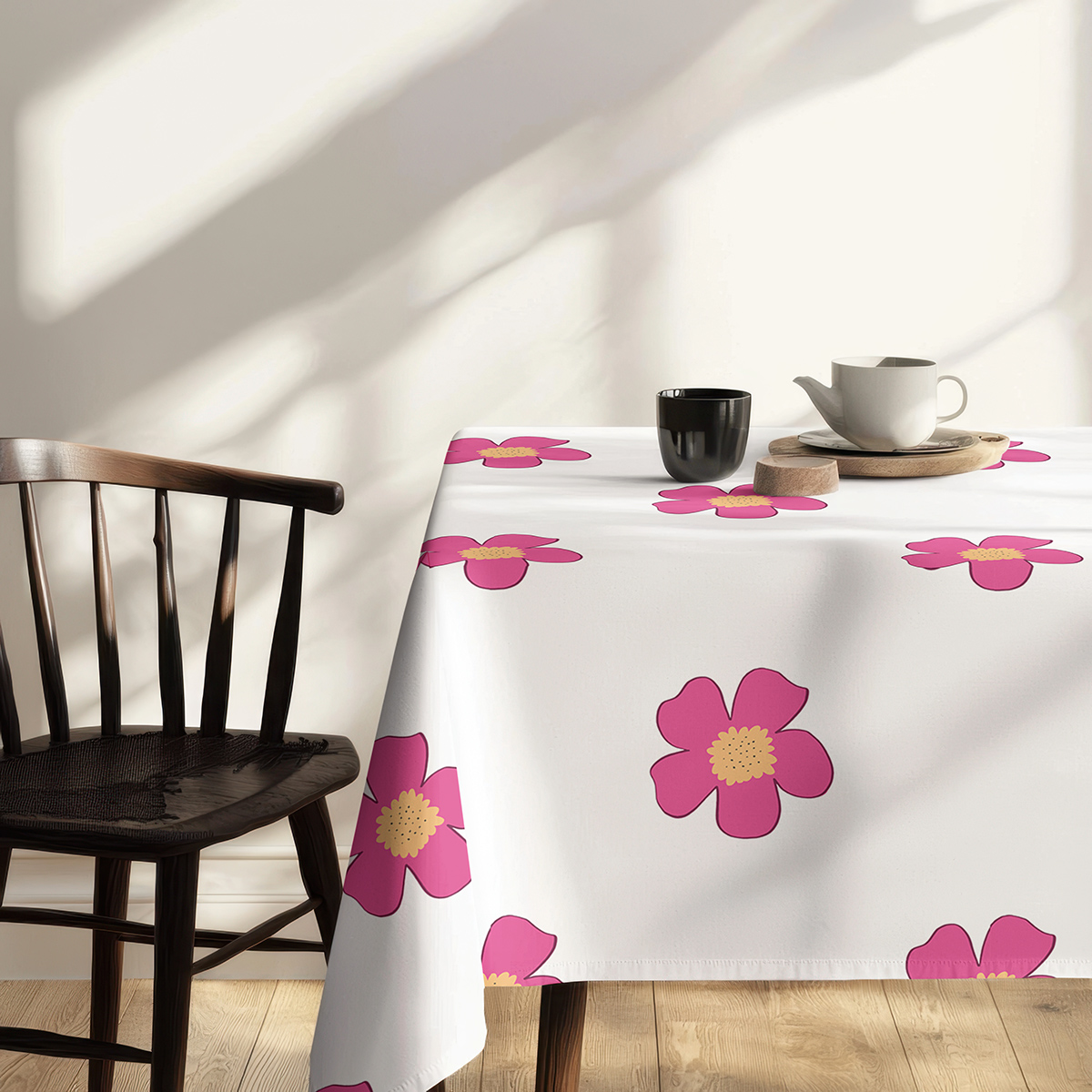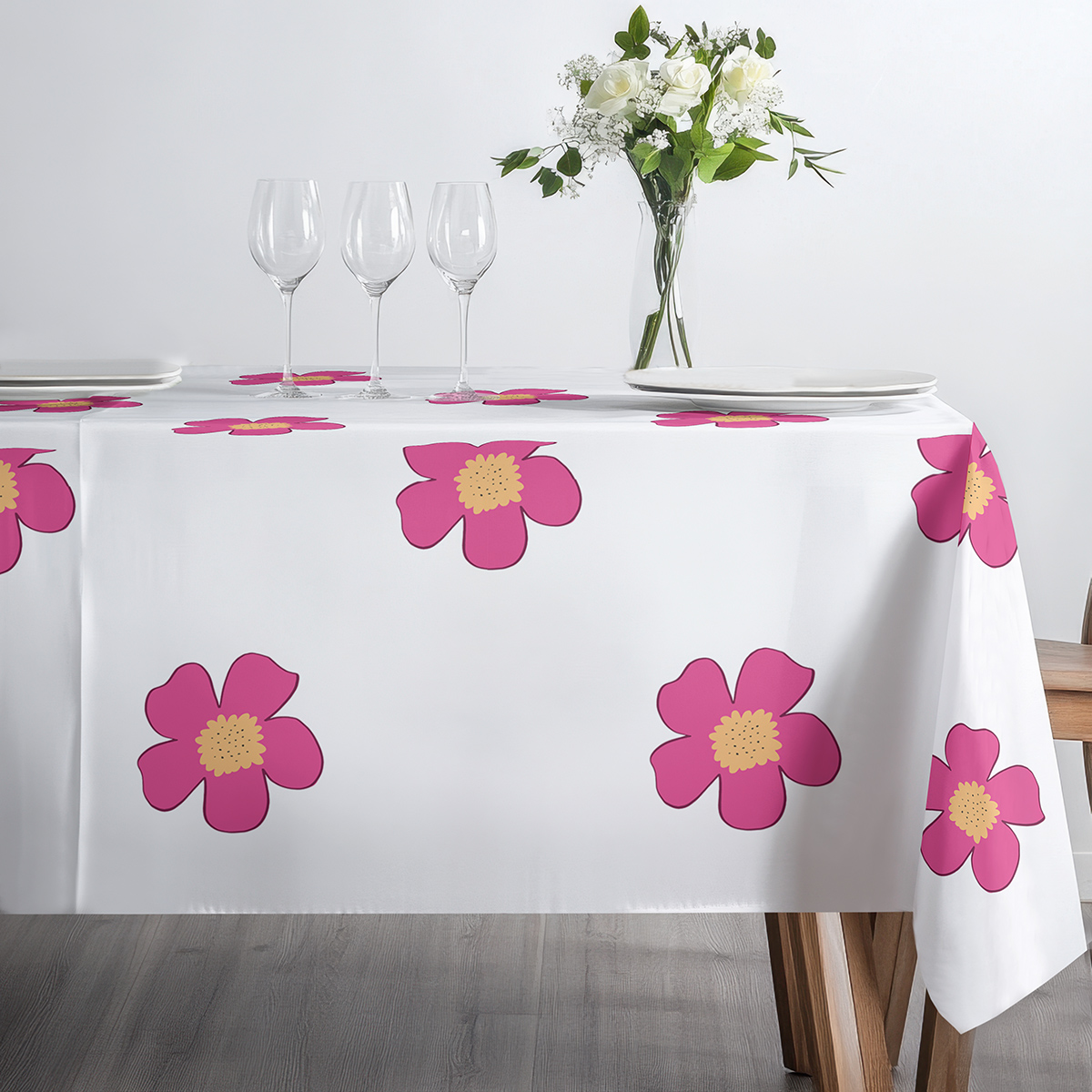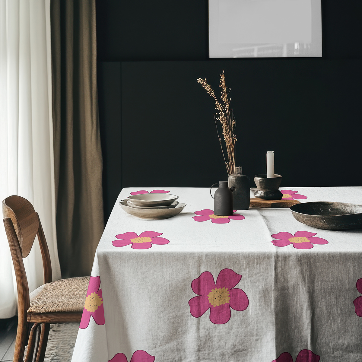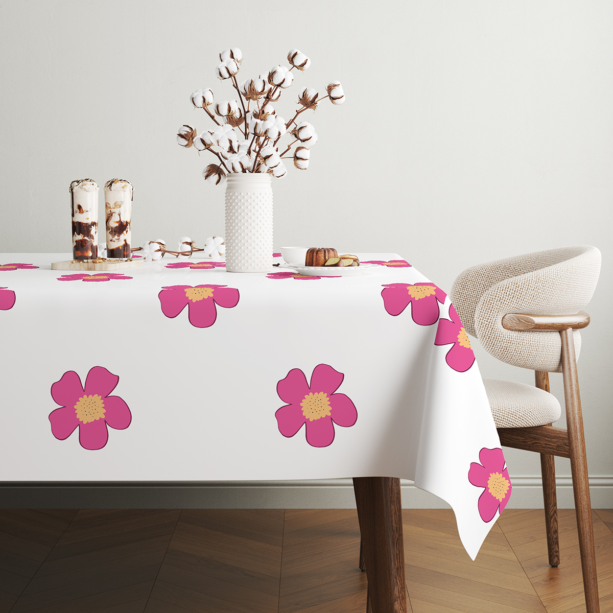 Energetyczny wzór z dużymi, stylizowanymi kwiatami ożywi każde nakrycie stołu. Obrus na jasnym tle tworzy świeży, nowoczesny akcent zarówno w codziennej kuchni, jak i podczas wyjątkowych spotkań.