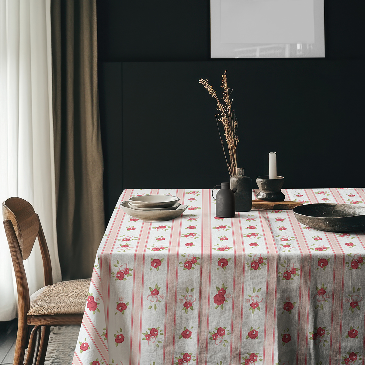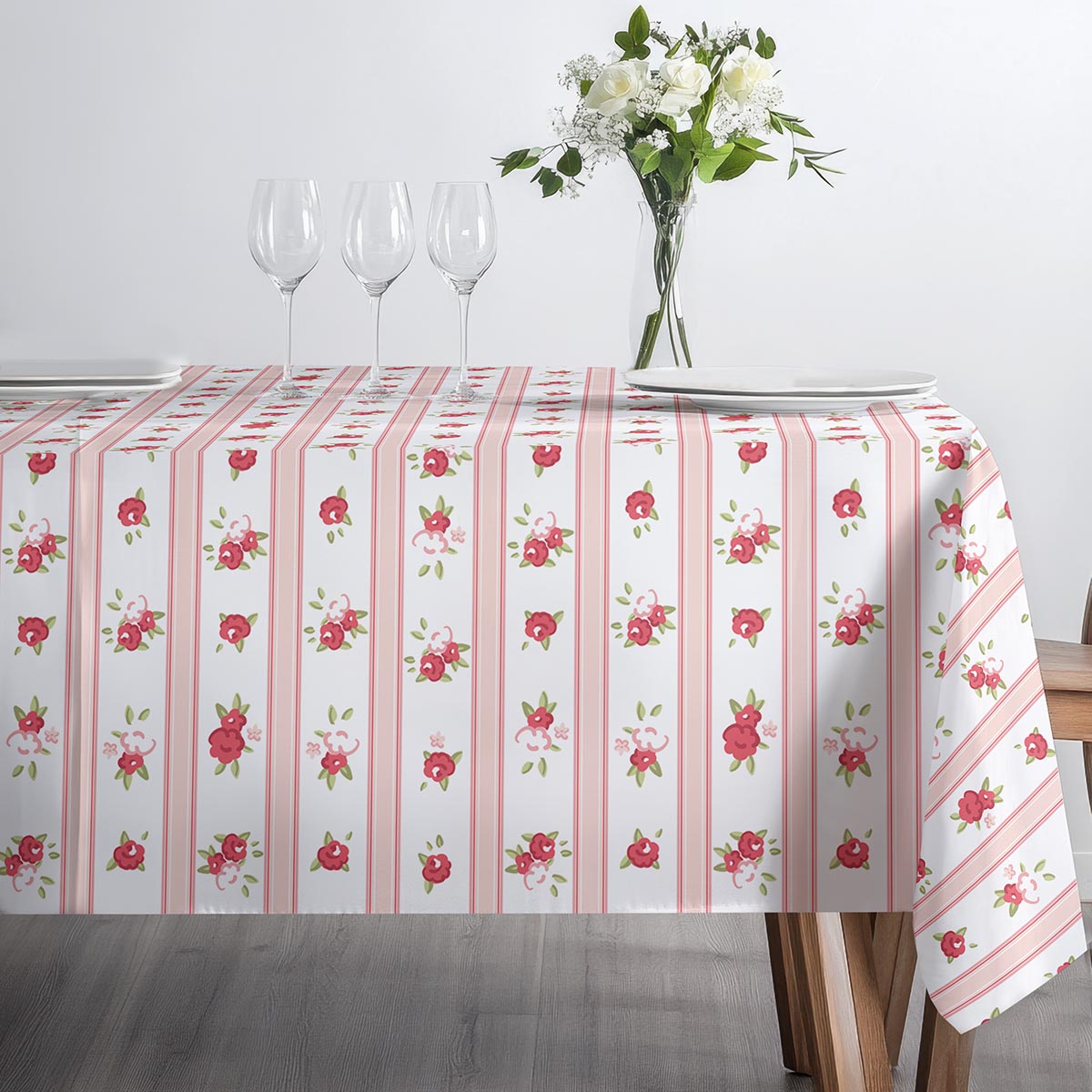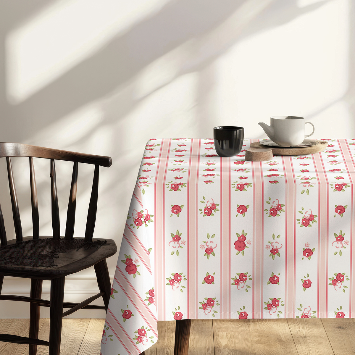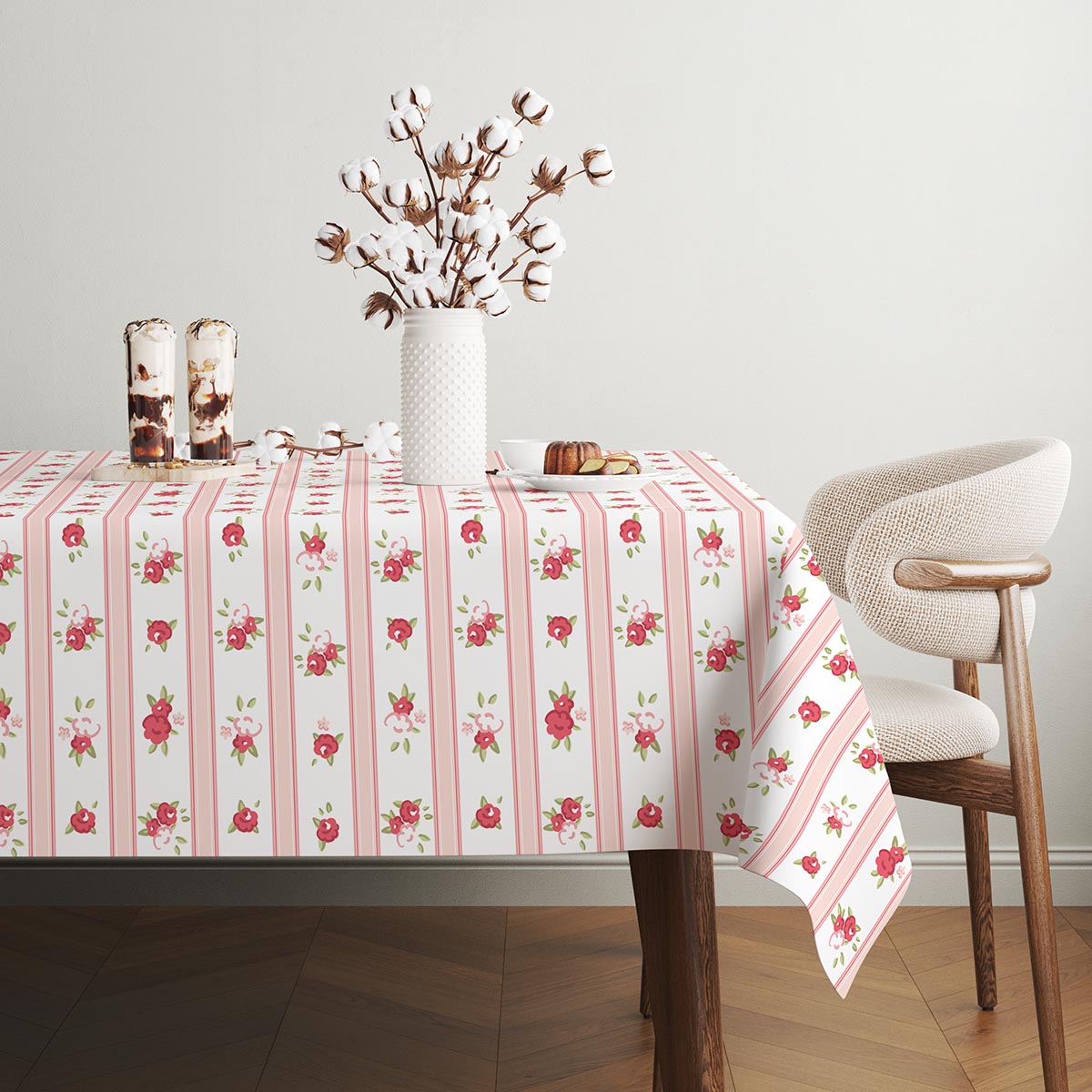 Delikatny obrus w pionowe pasy ozdobiony drobnymi różyczkami doda wnętrzu przytulnego, romantycznego charakteru. Idealny do codziennych posiłków i wyjątkowych spotkań, wprowadza świeży i subtelny akcent na stole.