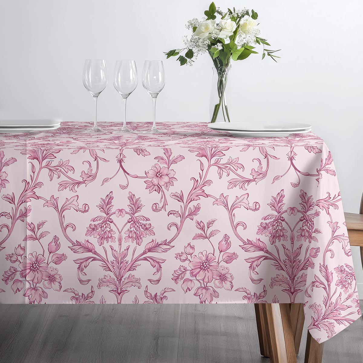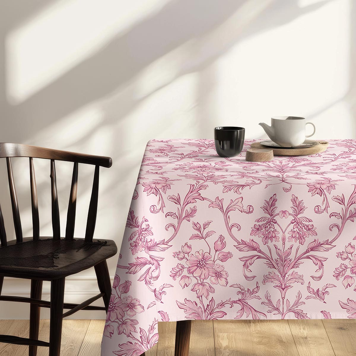Subtelny obrus z romantycznym, różowym ornamentem dodaje wnętrzu lekkości i klasy. Uniwersalny wzór sprawdzi się zarówno na co dzień, jak i przy wyjątkowych okazjach.