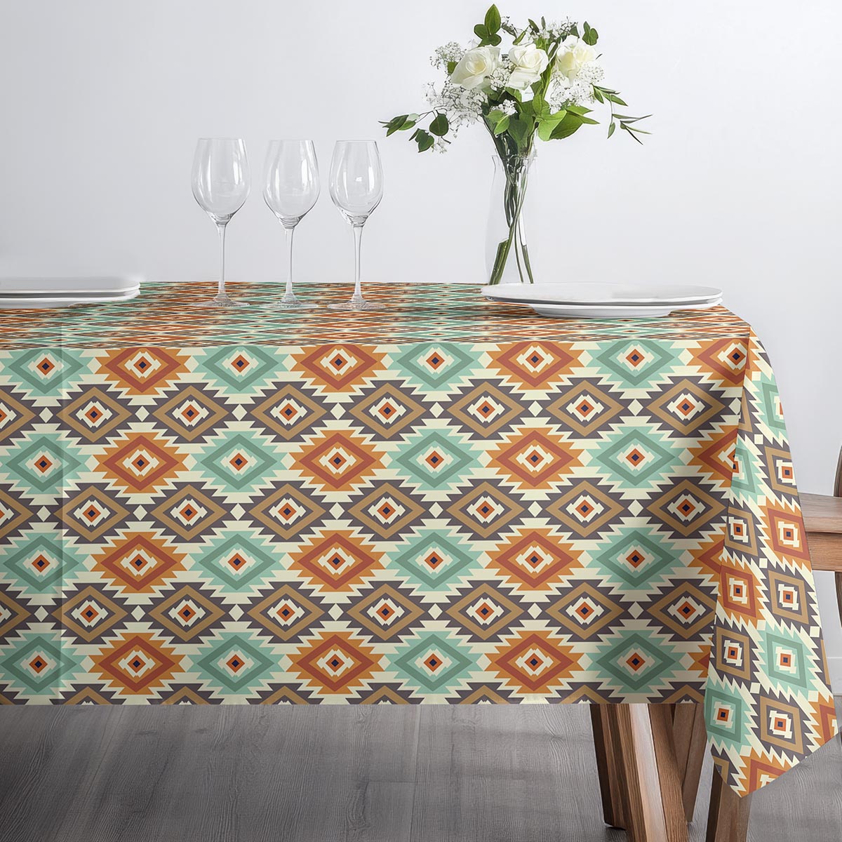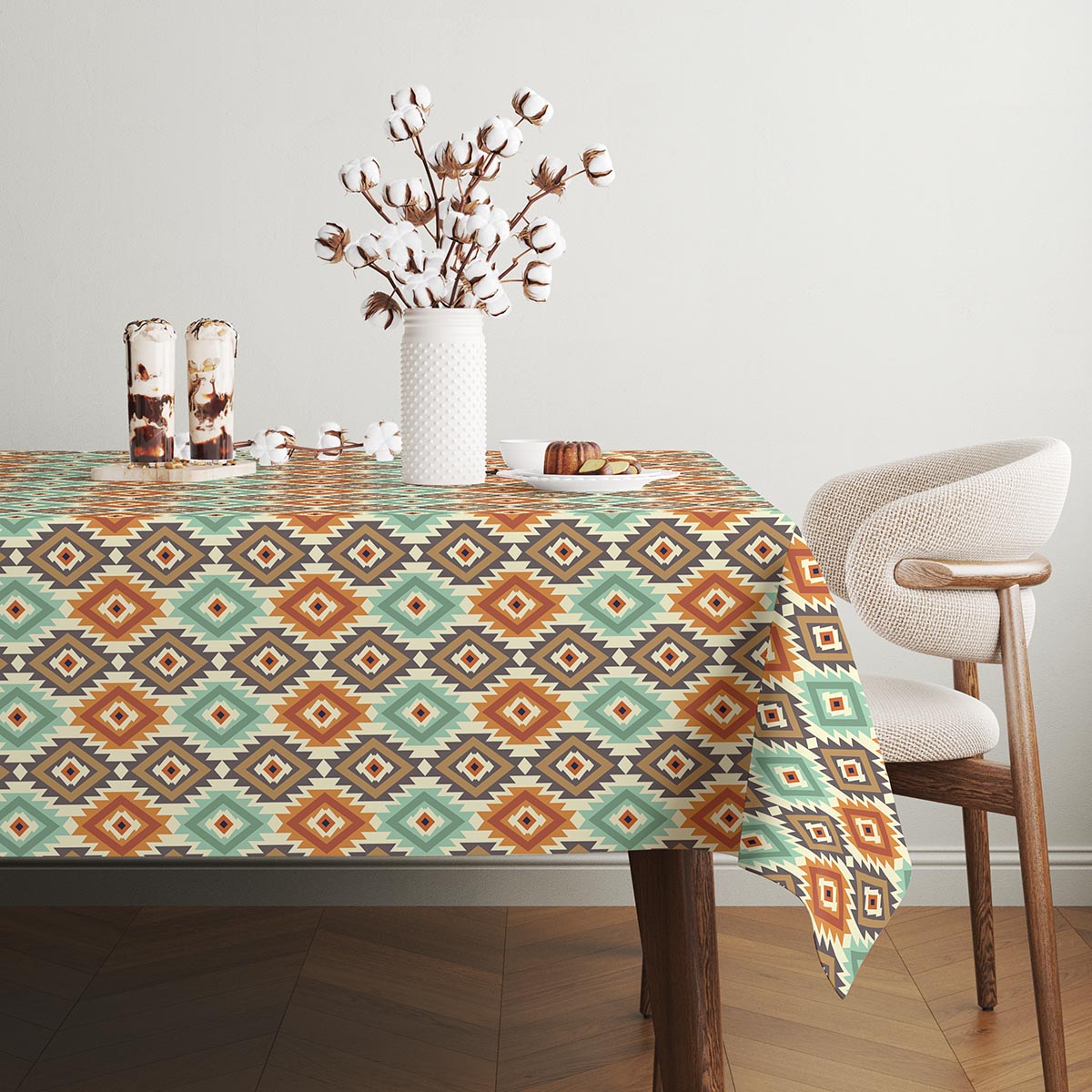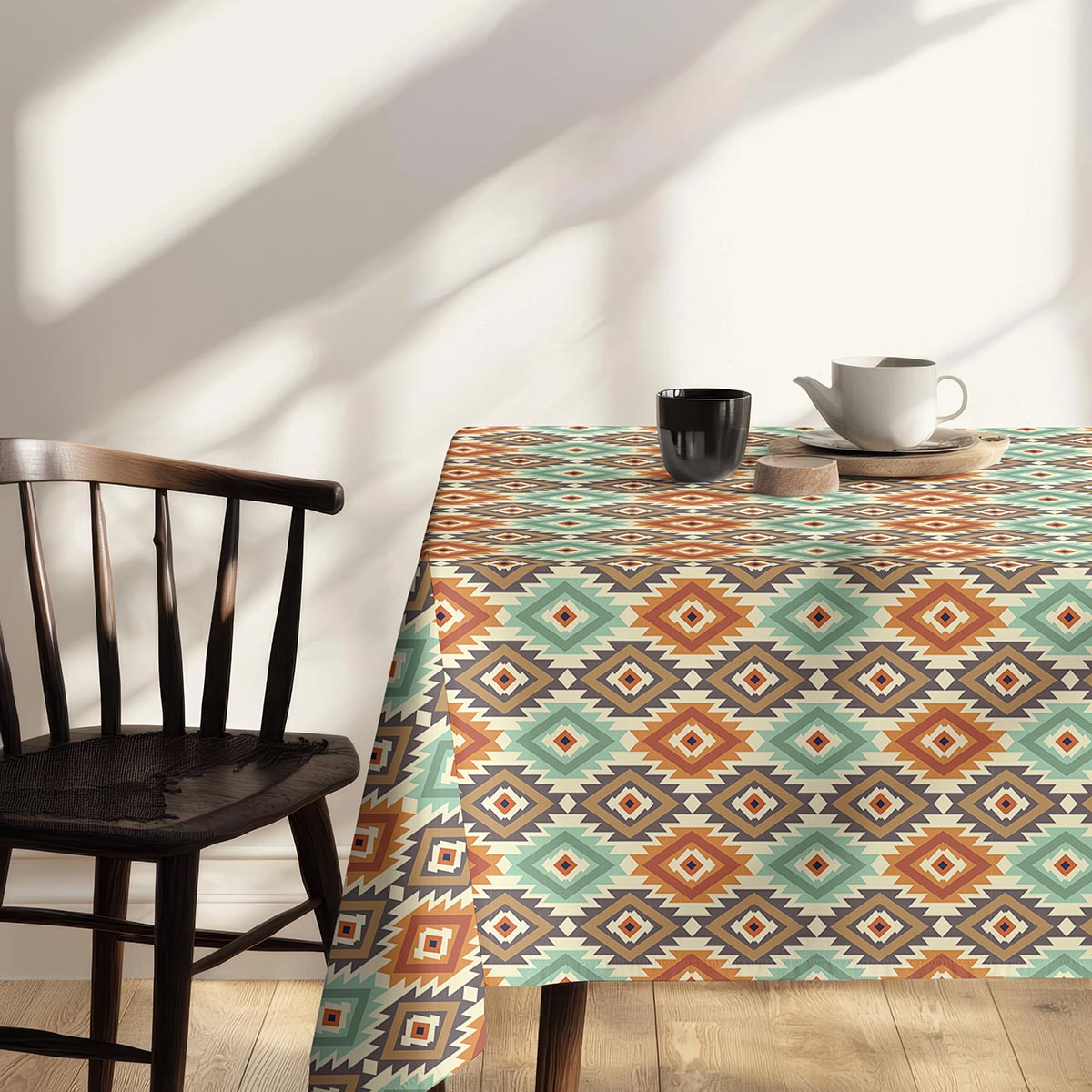 Dynamiczny, geometryczny wzór inspirowany motywami etnicznymi łączy miętowe, terakotowe i brązowe akcenty na ciepłym, kremowym tle. Powtarzające się romby tworzą rytm, który ożywia stół bez przeładowania.