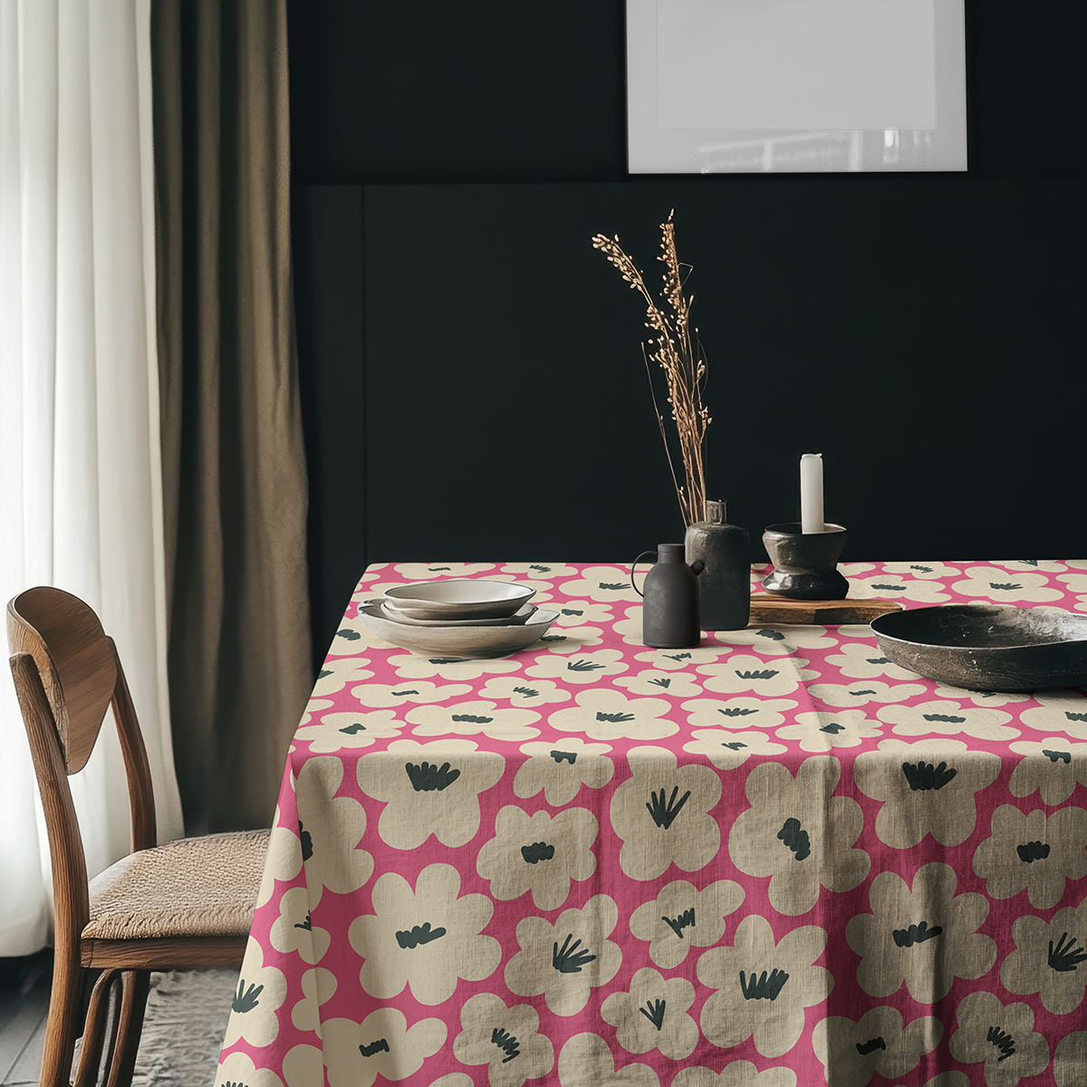 Delikatne, stylizowane kwiaty w kremowym odcieniu kontrastują z intensywnym malinowym tłem, a ciemne środki wzoru dodają całości wyrazu. Wzór jest nowoczesny z nutą retro, dzięki czemu pasuje do różnych aranżacji — od minimalistycznych po bardziej przytulne wnętrza.