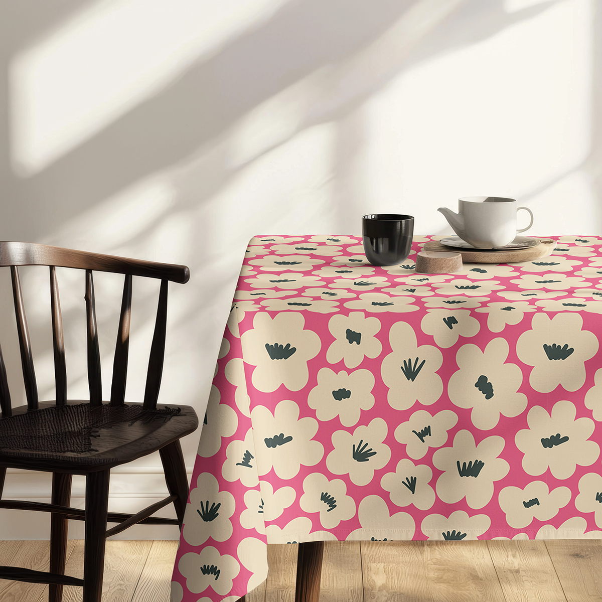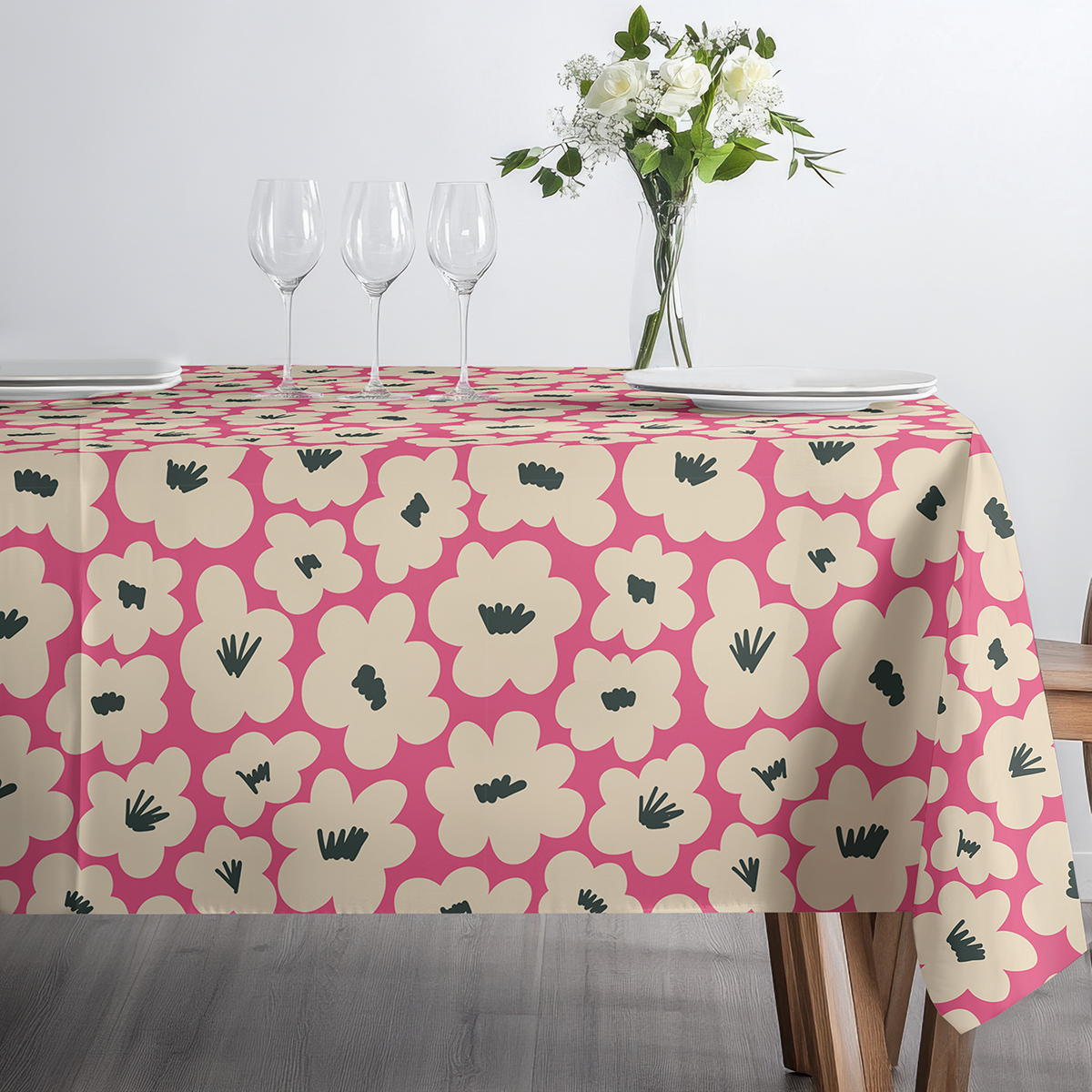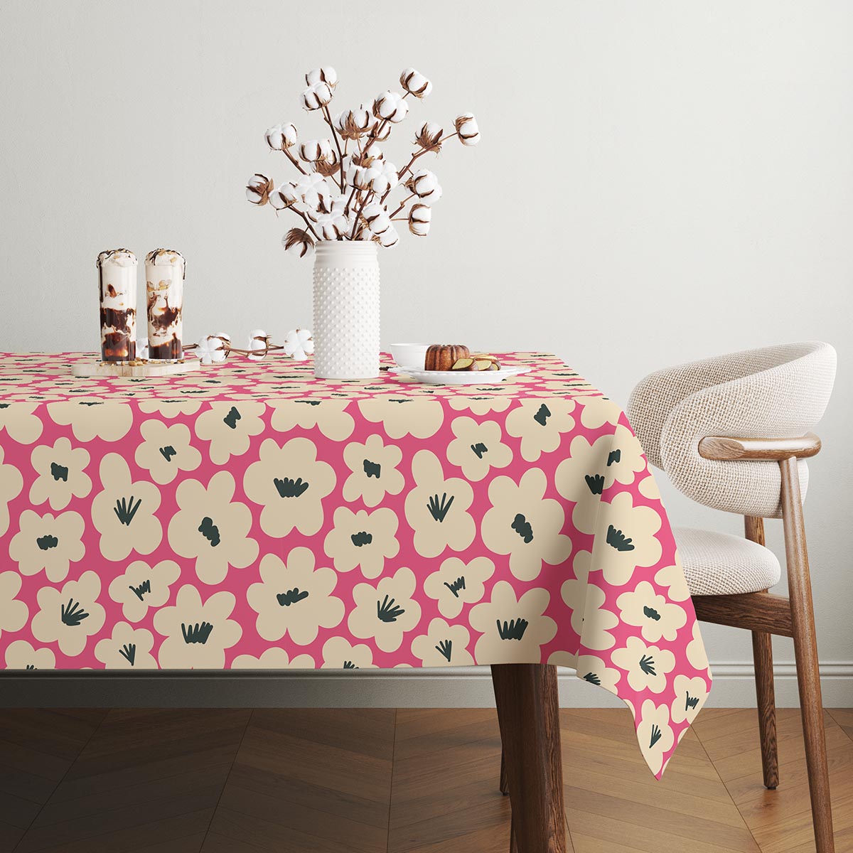 Żywy obrus z dużymi kremowymi kwiatami doda wnętrzu energii i przytulnego charakteru. Sprawdzi się zarówno przy codziennych posiłkach, jak i podczas spotkań z bliskimi.