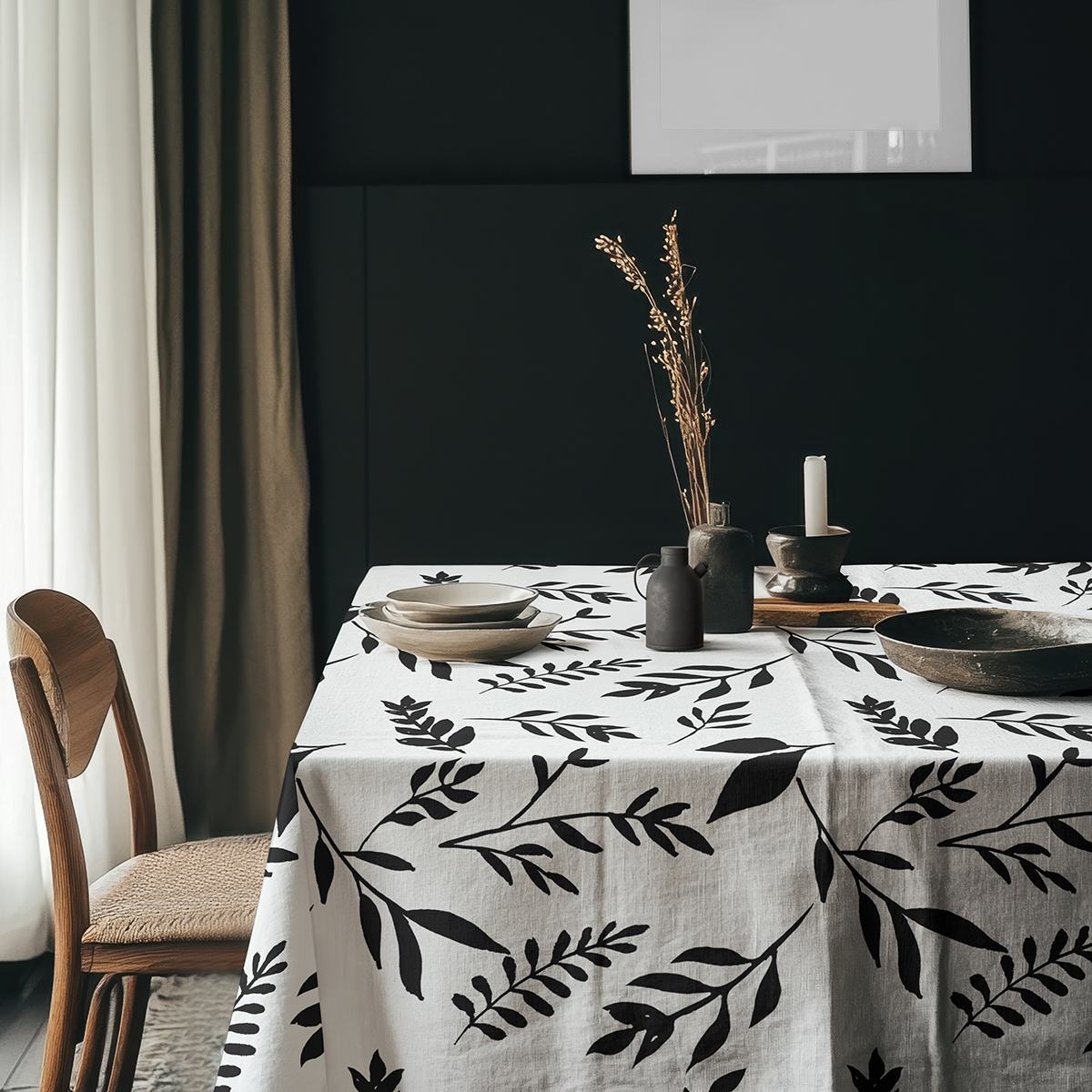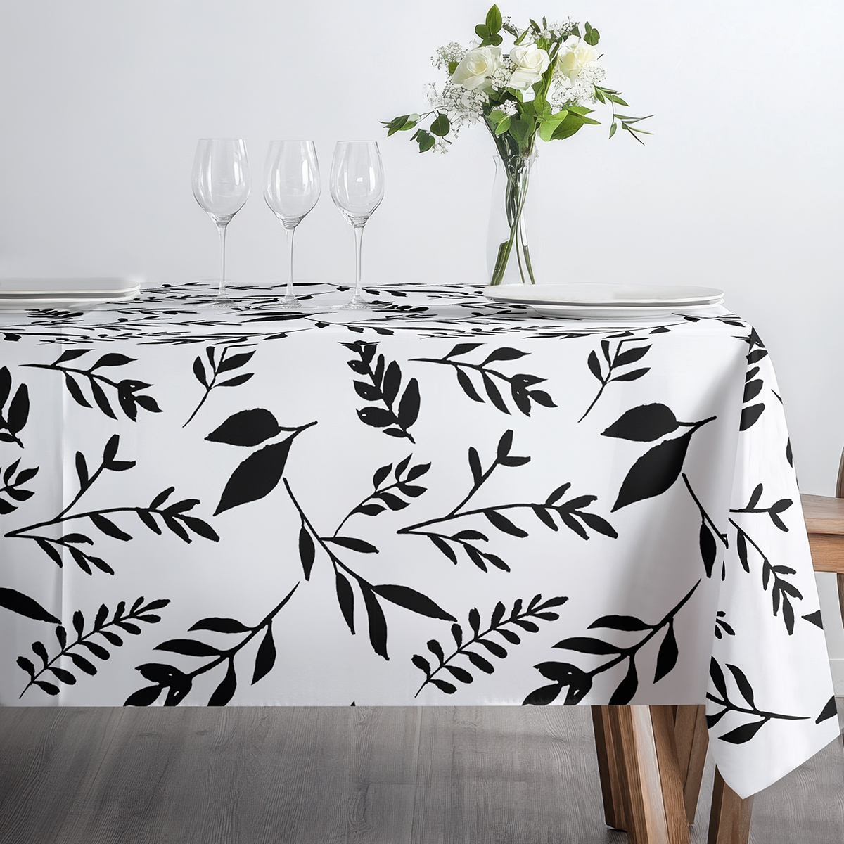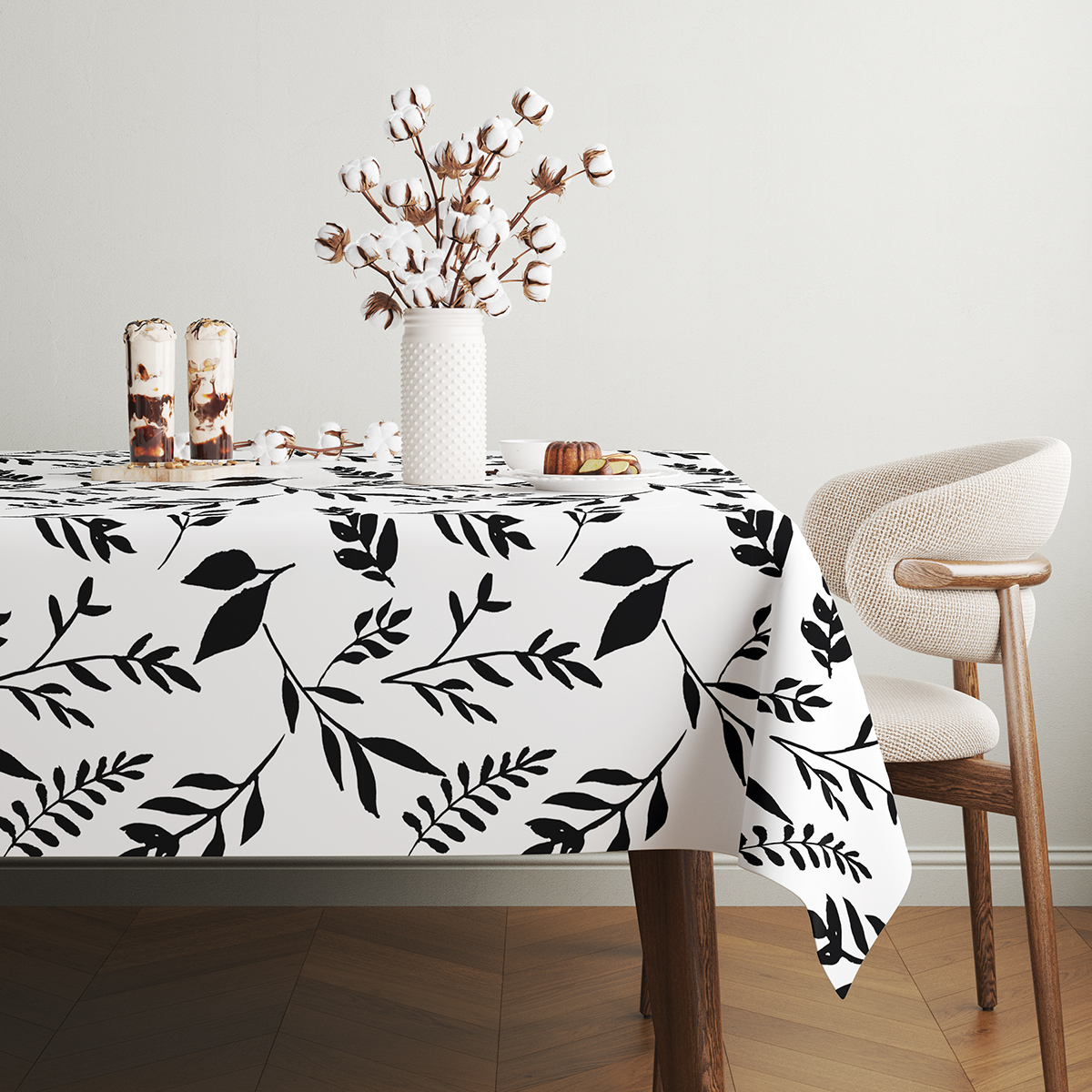 Ten obrus wyróżnia się dużymi, graficznymi gałązkami i liśćmi w kontrastowym, czarno-białym wzorze, który wprowadza świeżość i elegancję do stołu. Prostota motywu sprawia, że sprawdzi się zarówno we wnętrzach skandynawskich, jak i nowoczesnych, minimalistycznych aranżacjach.