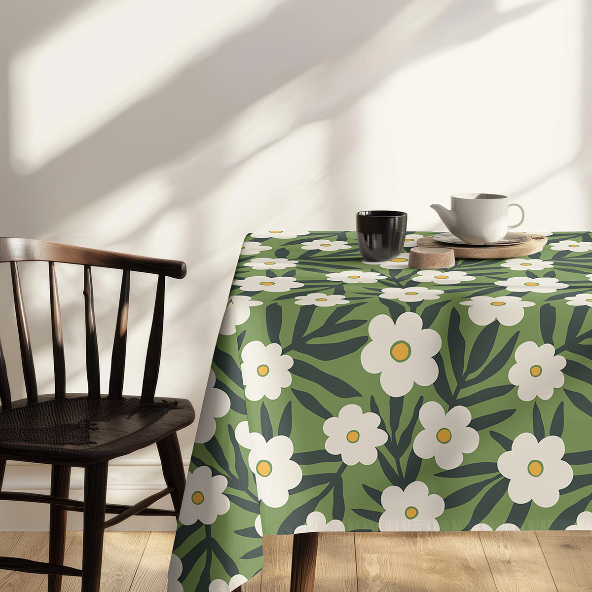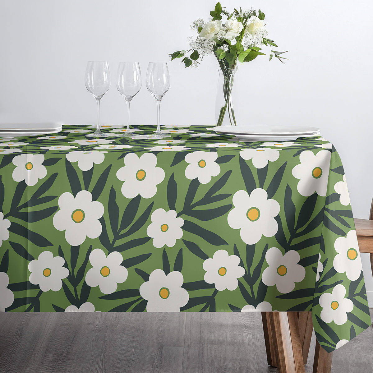 Ten obrus zdobi wyrazisty, florystyczny wzór z dużymi, prostymi białymi kwiatami o żółtych środkach na zielonym tle oraz smukłymi, ciemnozielonymi liśćmi. Kompozycja ma lekko retro, a zarazem nowoczesny charakter, dzięki czemu wnosi radosny, naturalny akcent do wnętrza.