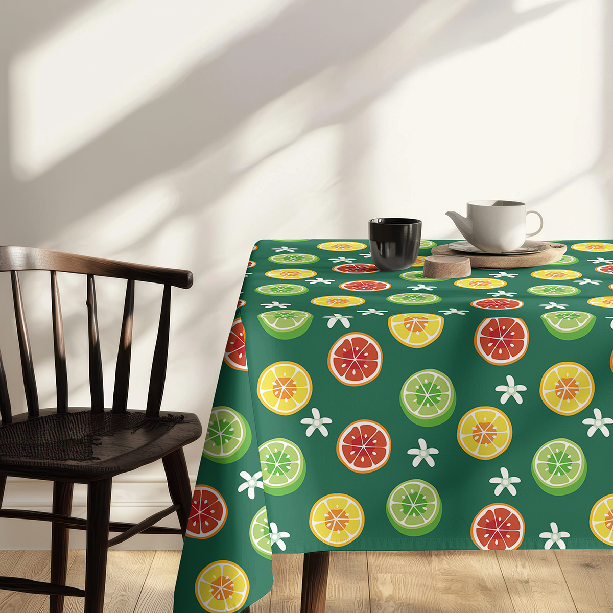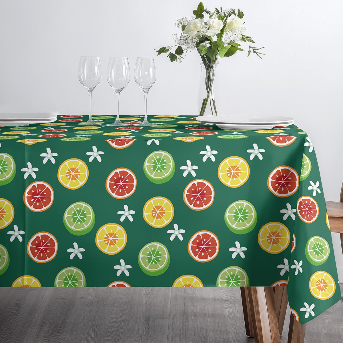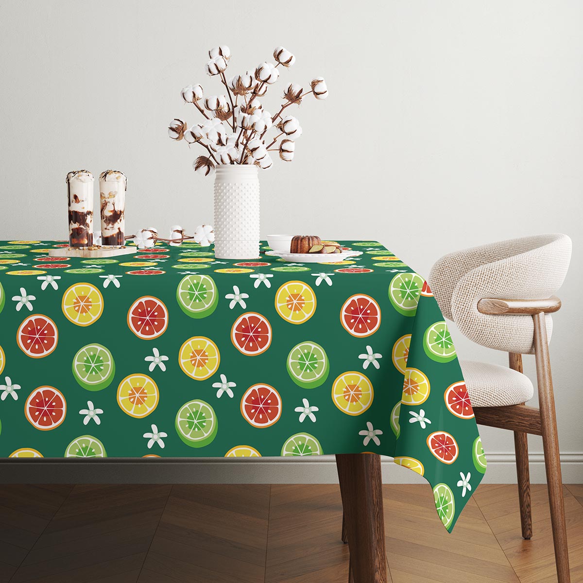 Ten obrus przyciąga wzrok żywymi plasterkami cytrusów na głębokim zielonym tle, tworząc świeżą i energetyczną oprawę stołu. Wzór łączy żółcie, zielenie i czerwienie, a delikatne białe kwiatuszki dodają mu lekkości.