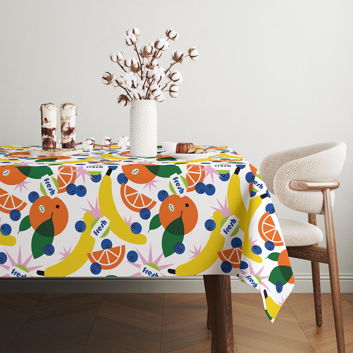 Pełen kolorów obrus z wyrazistym, grafikiem przedstawiającym banany, plasterki pomarańczy i drobne jagody wesoło rozrzucone na jasnym tle. Motyw uzupełniają drobne elementy z napisem „fresh”, które podkreślają świeży, wakacyjny charakter wzoru.