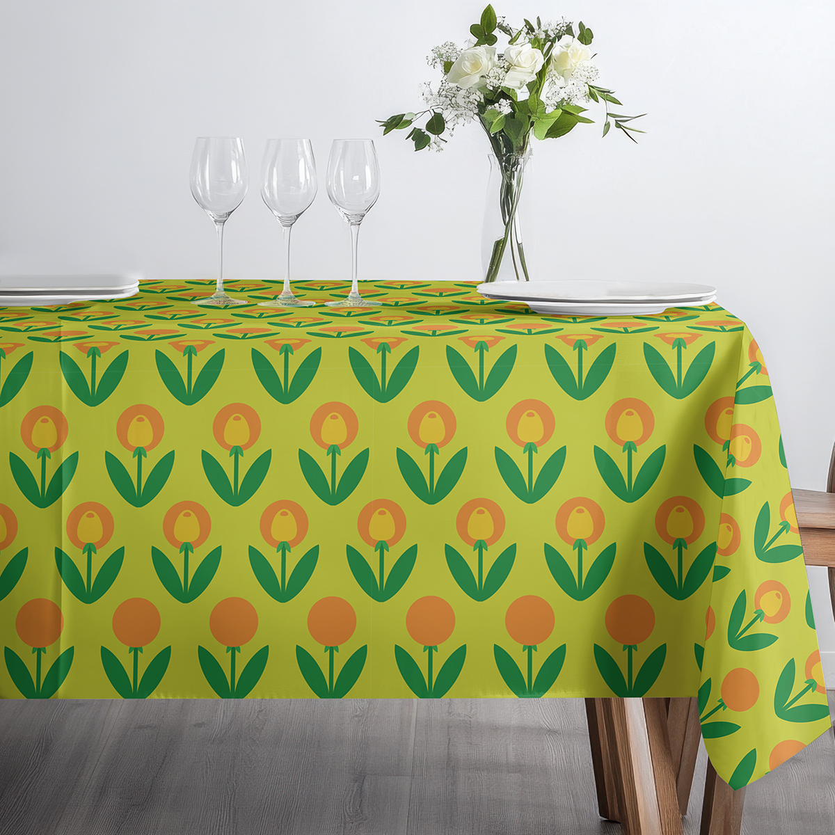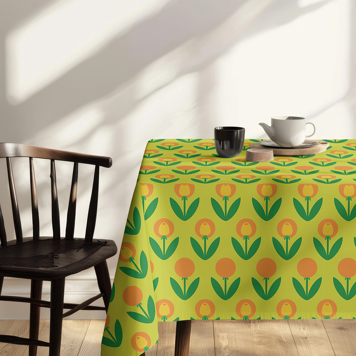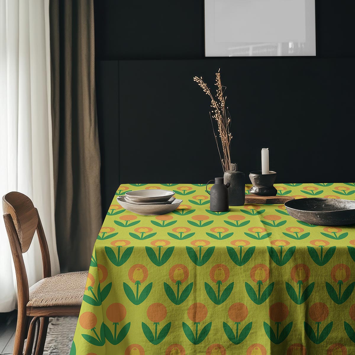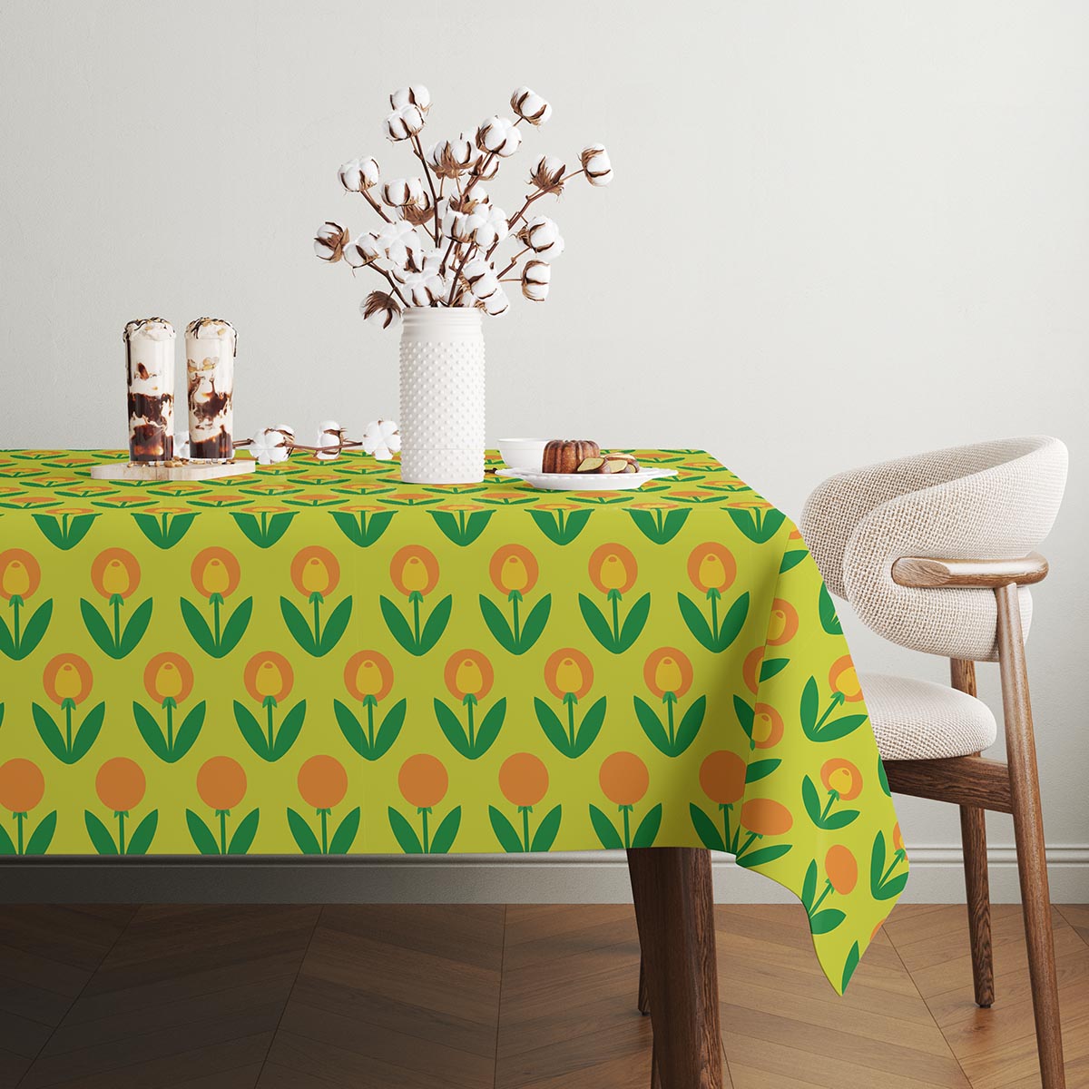 Ten obrus łączy prostą, geometryczną grafikę z intensywną paletą barw — jasną zielenią tła oraz pomarańczowo-żółtymi tulipanami. Wzór nawiązuje do retro estetyki i wnosi do wnętrza optymistyczny, przytulny nastrój.