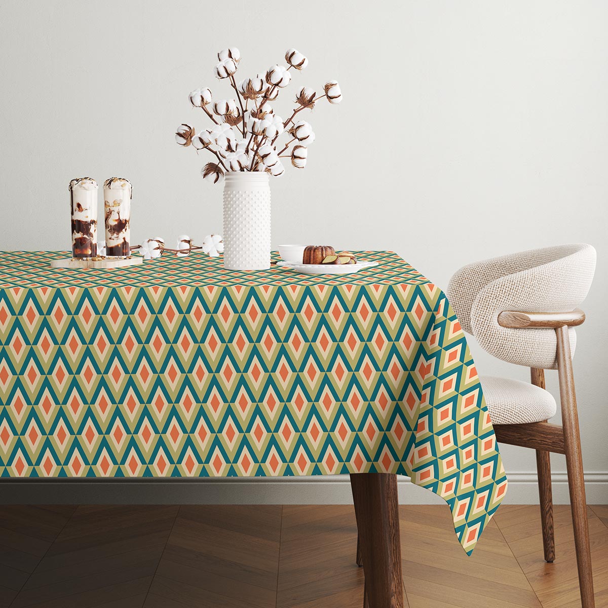 Wyrazisty obrus z powtarzalnym wzorem rombów doda charakteru każdemu stołowi. Trwały materiał i żywe, ciepłe kolory sprawdzą się na co dzień i przy wyjątkowych okazjach.